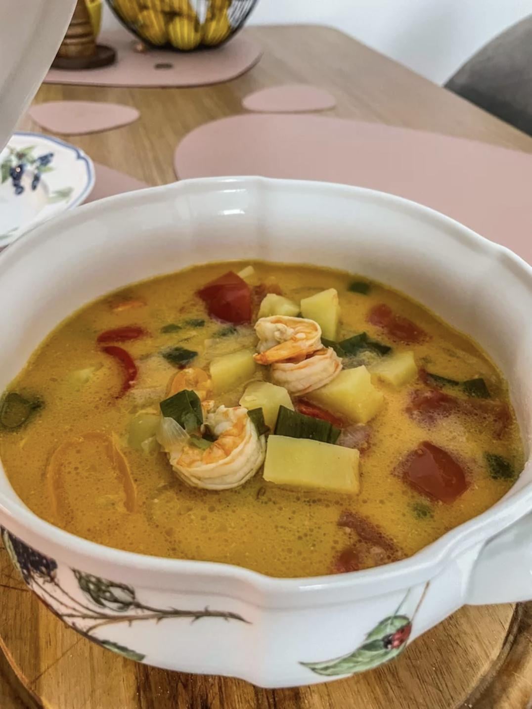 Zwiebel in Halbringe, Kartoffel in kleine Würfel schneiden und in den Topf geben. Kokosmilch, Wasser und Garnelen hinzufügen und 15 Min. kochen.