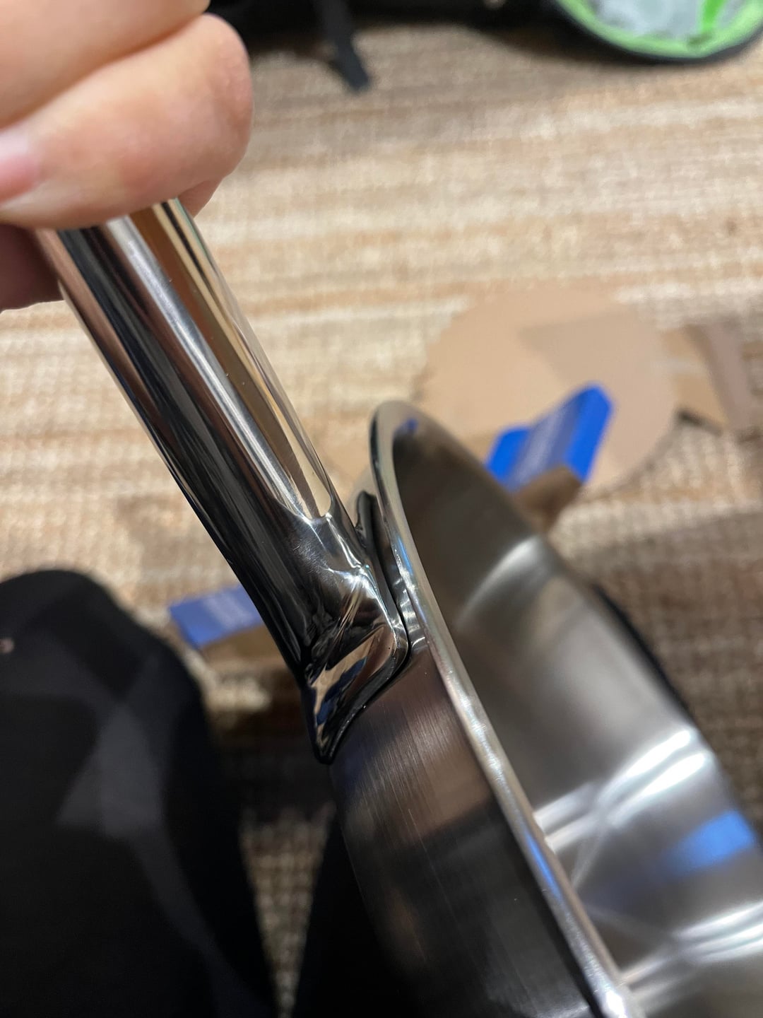 Habe meine erste Edelstahl-Pfanne online erworben und mich schon wie bolle drauf gefreut, immerhin eine Spring Brigade! Mit 5-Lagen! Auf dem Werbeklappentext steht zum Griff: "kein Eindringen von Wasser möglich, dauerhaft mit Pfannenkörper verschweißt" und dann aber das.