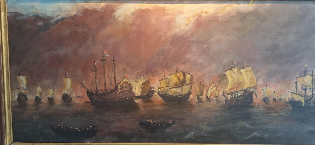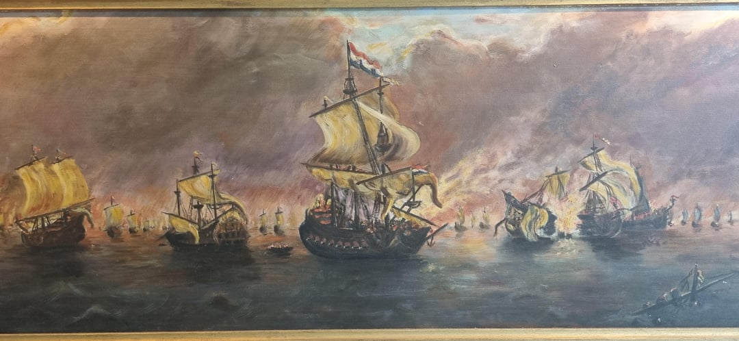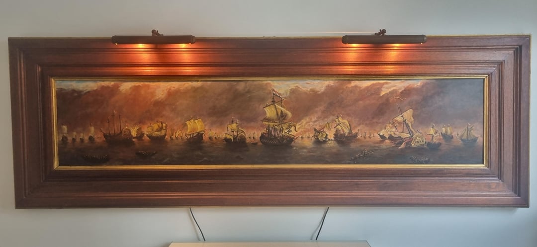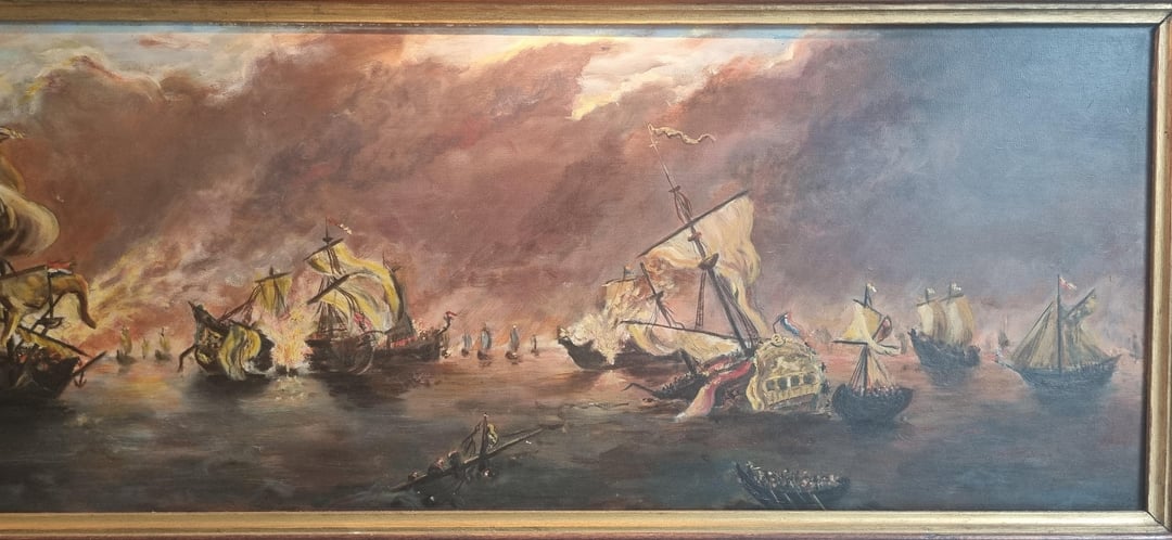 Mein eigener Gedankengang: Wahrscheinlich inspiriert vom Goldenen Zeitalter (mehrere Pinas-Schiffe, Heckrückkehrschiffe und Firmenyachten). Das auffälligste Schiff ist links zu sehen, ohne Rahen und ohne Segel. Am Hauptmast ist die niederländische Flagge zu sehen. Was mir auffällt, ist, dass die Flagge auf dem Spiegel rot ist und in der Ecke einen kleinen weißen Bereich aufweist. Das erinnert sehr an die englische Seeflagge von 1620 bis 1707. Deshalb erinnert es mich an ein Gemälde von Peter van de Velde über die Reise nach Chatham, auf dem die HMS Royal Charles ähnlich aussieht. Allerdings ist der Medway eine relativ schmale Wasserstraße und logischerweise sollte irgendwo Land sichtbar sein. Also vielleicht eine weitere Seeschlacht in einem der englischen Kriege?