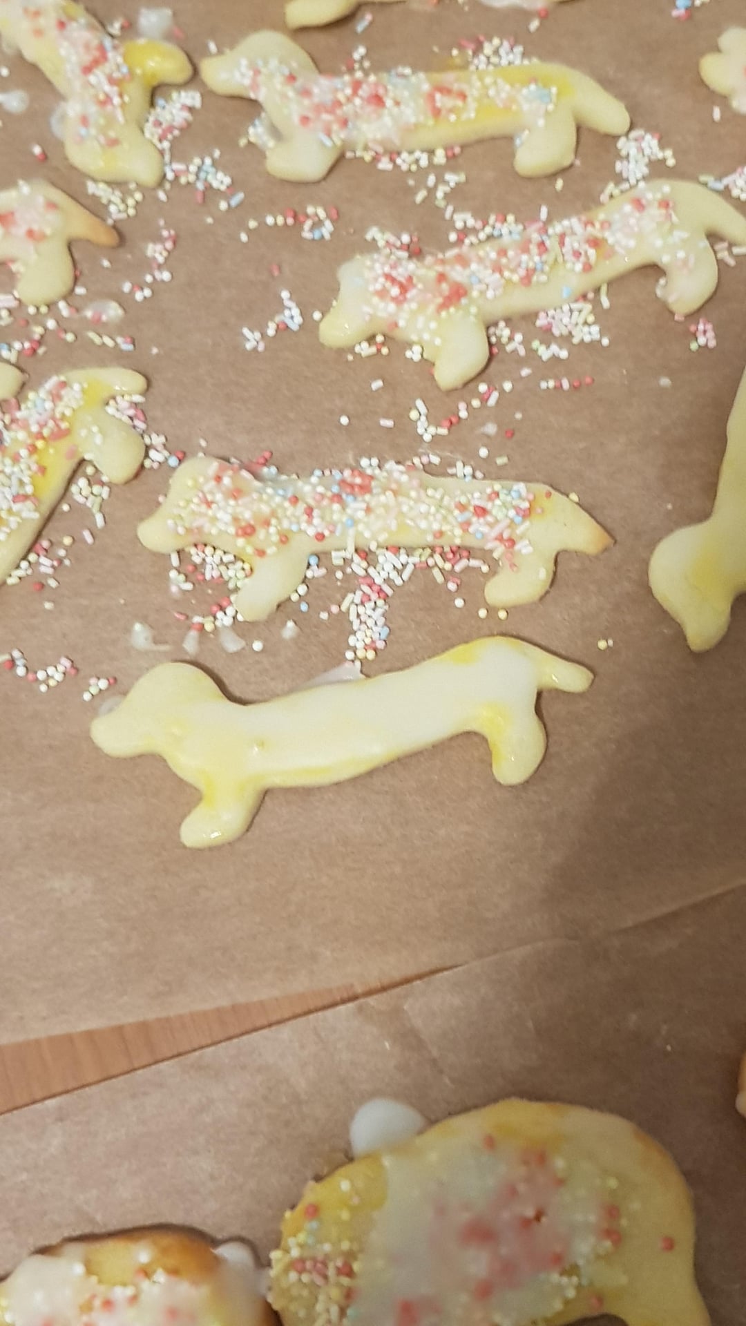 Elefanten und Dackel, mit Zuckerguss und Streusel, nur mit Zuckerguss und mit Schokolade und Streusel.