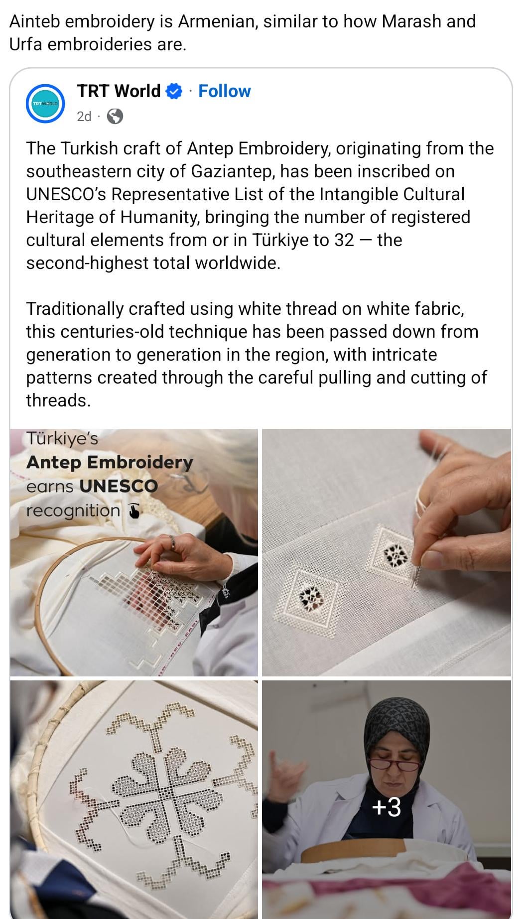 Bitte kontaktieren Sie die Unesco und verbreiten Sie die Nachricht. Dabei handelt es sich um einen armenischen Stickstil, der wie so vieles von unserem Erbe übernommen wird. Ein ähnliches Beispiel ist die Umbenennung des armenischen Knotens.