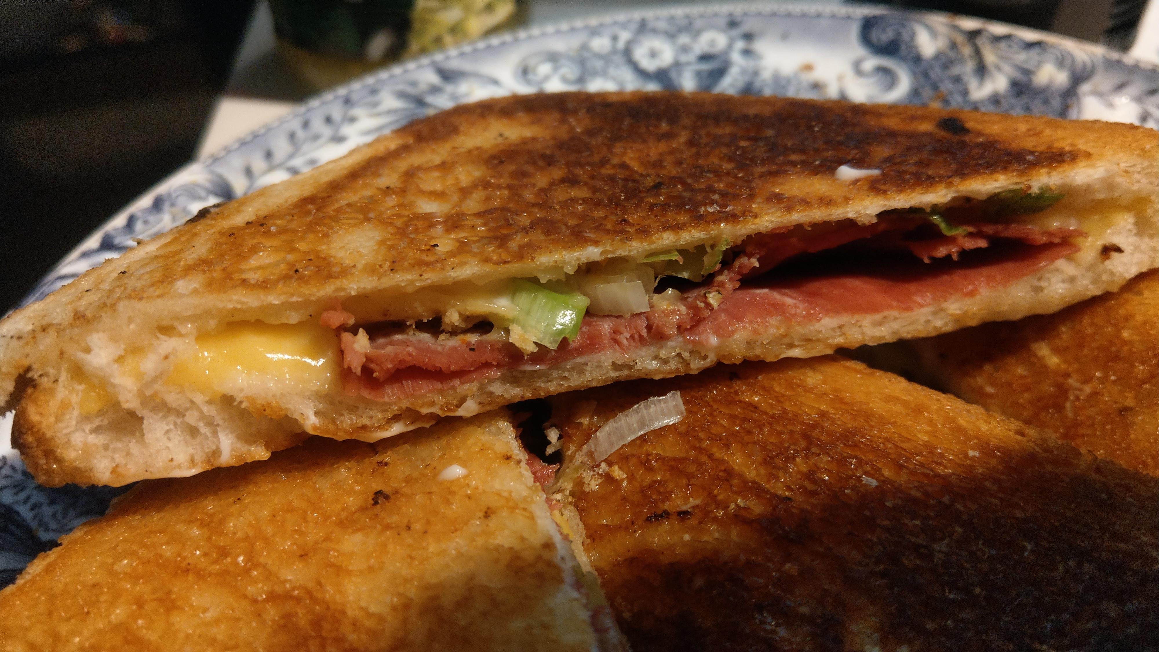 Nicht die ersten und vermutlich nicht die letzten Grilled Cheese Sandwiches heute. Diesmal noch optimiert mit Lekka Landschinken und Lauchzwiebeln.
