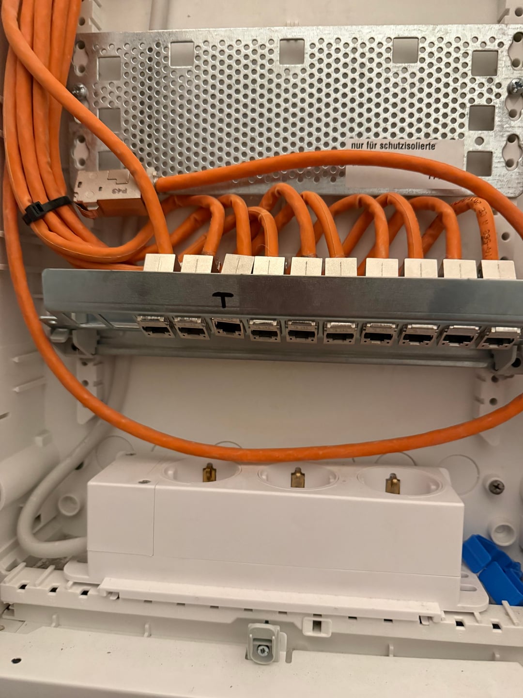 But yes, all I see in that photo is your network caninet (or structured media cabinet or “Unterputzverteiler”), with what appear to be 11 Cat6 cables terminated in keystone blocks. (Which is very much the correct way to do such an install. About the only change I’d make is to have also used “smurf tube” but perhaps they have and it’s just not visible in this photo.) That’s an uncommonly high number of cables (in comparison, my current unit only has three, one for each main room) so I’m super curious where they’re all going. Does your place have many rooms? Or perhaps they’ve run multiple cables to each room? In any case, what I *don’t* see in this photo is a TAE socket. Or indeed, anything that appears to be a connection for incoming Internet service.