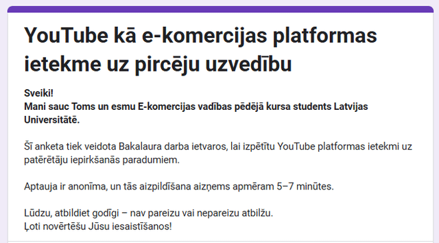 Ich studiere im letzten Jahr E-Business-Management. Ich schreibe derzeit eine Bachelorarbeit über den Einfluss von YouTube als E-Commerce-Plattform auf das Käuferverhalten. Und damit muss ich ziemlich viele Daten über uns Letten sammeln, die YouTube nutzen (oder nicht nutzen). Deshalb habe ich einen relativ kurzen, anonymen Fragebogen erstellt, der 5-7 Minuten dauert (es gibt Leute, die ihn in 2 Minuten ausfüllen), und ich wäre Ihnen sehr dankbar, wenn Sie auf den untenstehenden Link klicken und meinen Fragebogen ausfüllen würden!