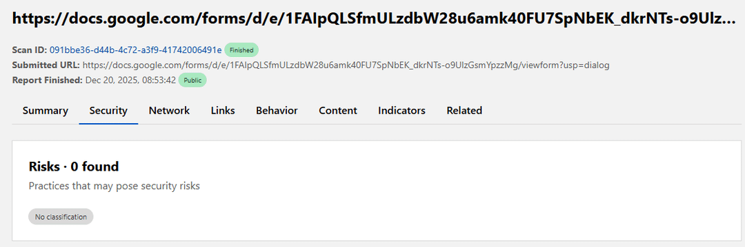 Ich verstehe, wenn Sie über Sicherheit nachdenken – der Link führt zu einer Google Forms-Umfrage und der Einfachheit halber habe ich einen Screenshot mit einer Überprüfung des in Nupatka erstellten Links gepostet. Es gibt eine ganze Reihe Link-sicherer Tools, mit denen man prüfen kann, ob der Link sicher ist.