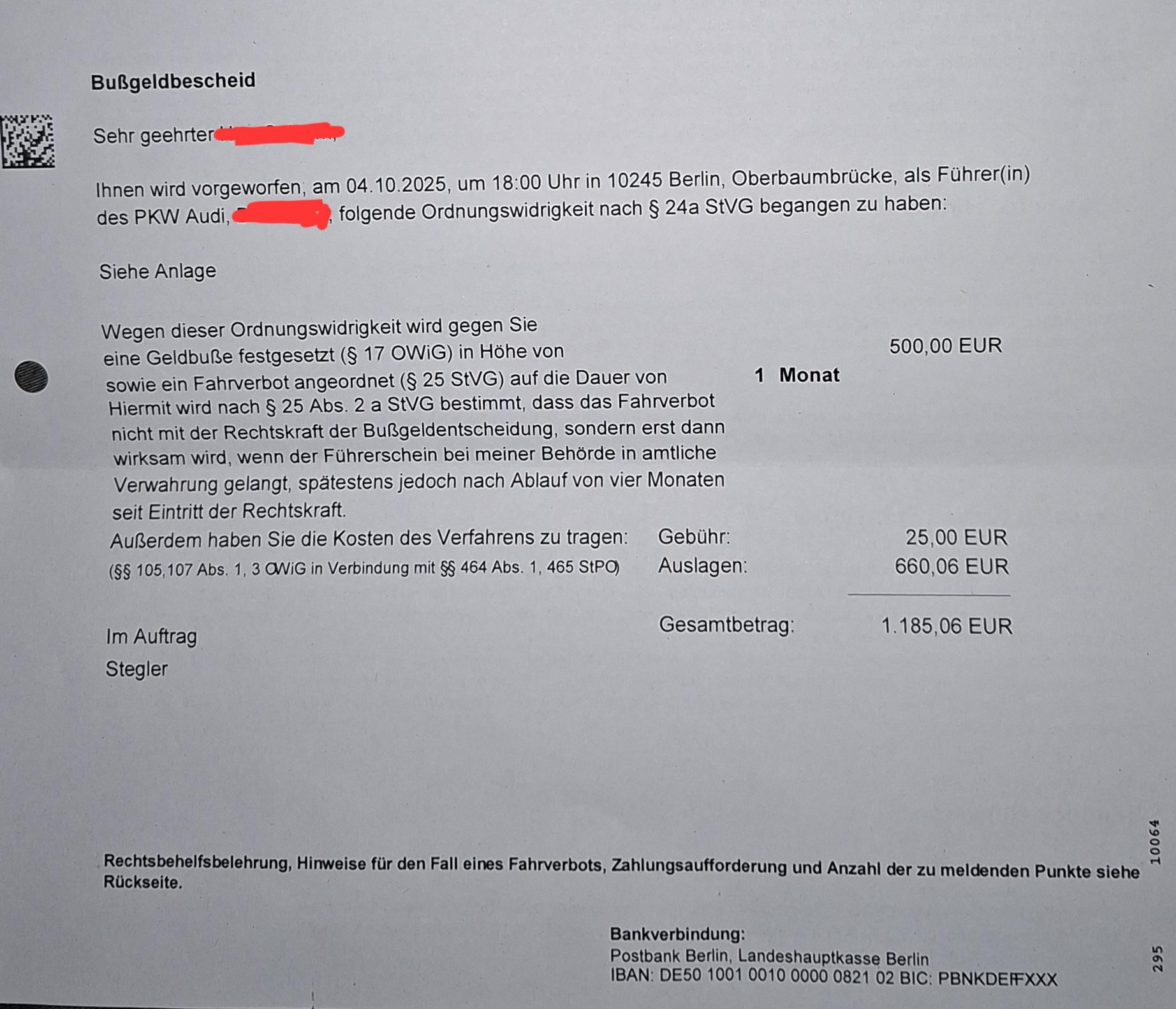 Hat sich jemand in Deutschland mit einem §24a StVG THC-Bußgeldbescheid (500€ + 1 Monat Fahrverbot + ~600€ Auslagen für Blutuntersuchung) befasst? Hat ein formeller Einspruch tatsächlich geholfen (reduziert/entfallen) oder ist es besser, ihn anzunehmen und zu bezahlen? Alle praktischen Tipps sind willkommen. Das Vorhandensein von THC wurde einen Tag zuvor festgestellt. Der Fahrer war zum Zeitpunkt der zufälligen Polizeikontrolle völlig nüchtern. Es besteht die Möglichkeit, Einspruch zu erheben und möglicherweise den Bericht und die Fallakte anzufordern, aber ist das überhaupt hilfreich?