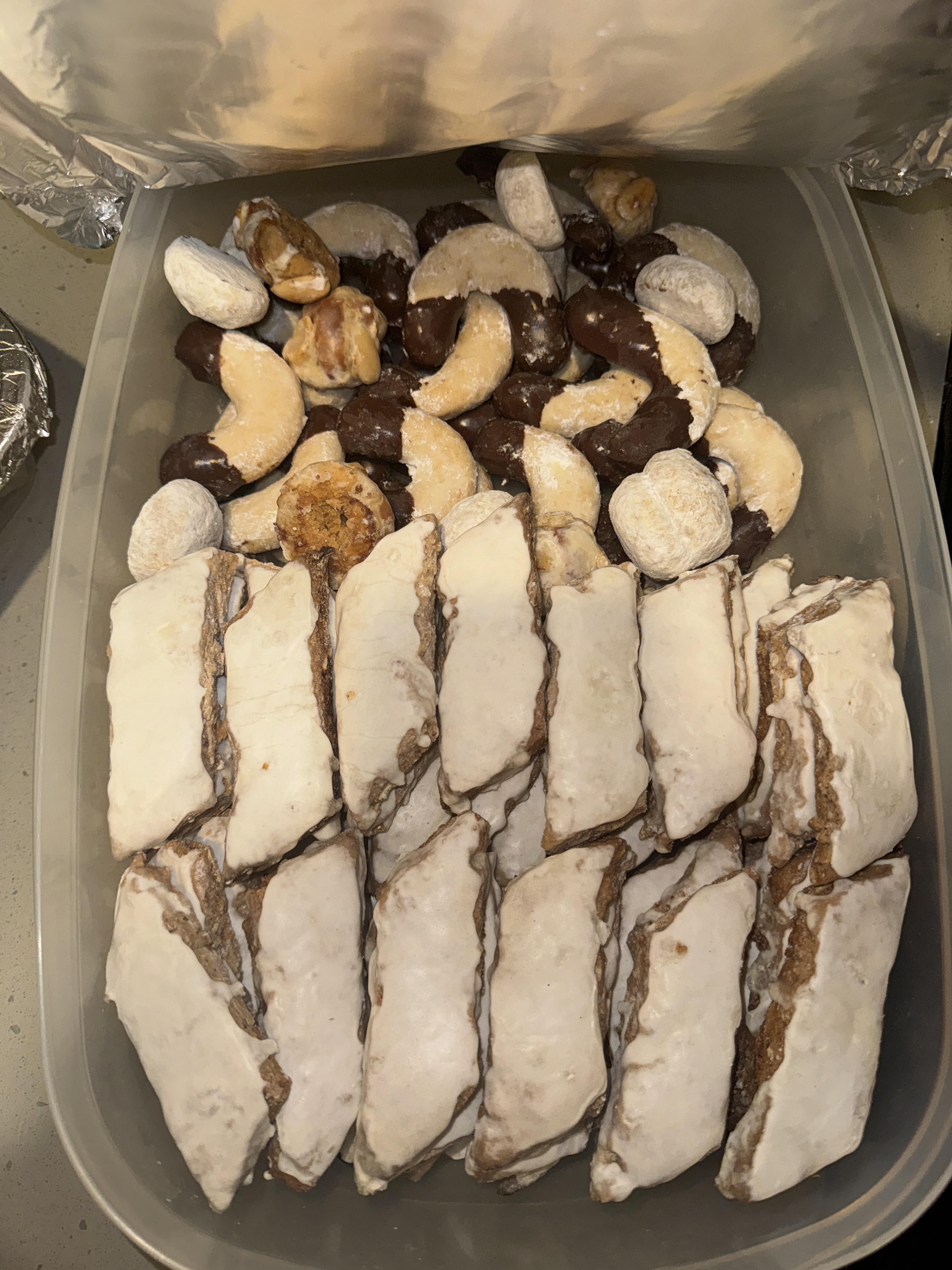 Hallo zusammen, ich habe eine Frage bezüglich der Namen einiger Weihnachtsplätzchen auf dem Bild, das ich angehängt habe. Meine Oma ist letzten Januar verstorben und dies wird das erste Weihnachtsfest meiner Familie ohne sie sein, und sie hat diese Kekse immer als Geschenk gemacht. Ich hatte gehofft, die Namen und möglicherweise Rezepte für diese Kekse zu finden, um meine Familie mit einem ähnlichen Geschenk zu überraschen.