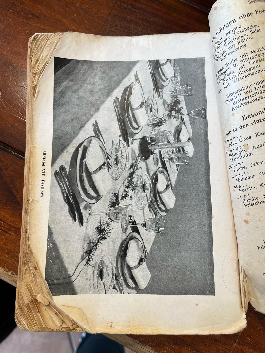 Hmm… meine Oma hatte aus der Hauswirtschaftslehre das Dr. Oetker Schulkochbuch Ausgabe 1948.