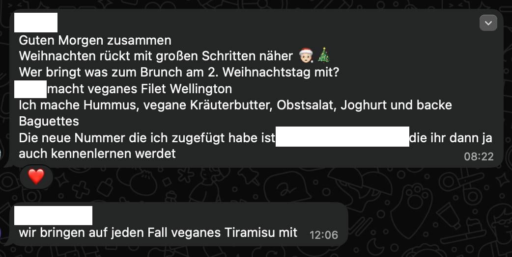 Die Personen in dem Screenshot sind keine Veganer und bringen trotzden ausschließlich pflanzliches Essen mit. Einfach aus Rücksicht und weils halt trotzdem gut schmeckt. Niemand hat irgendwas angesprochen oder verlangt. Niemand bricht sich einen Zacken aus der Krone. Es passiert einfach.