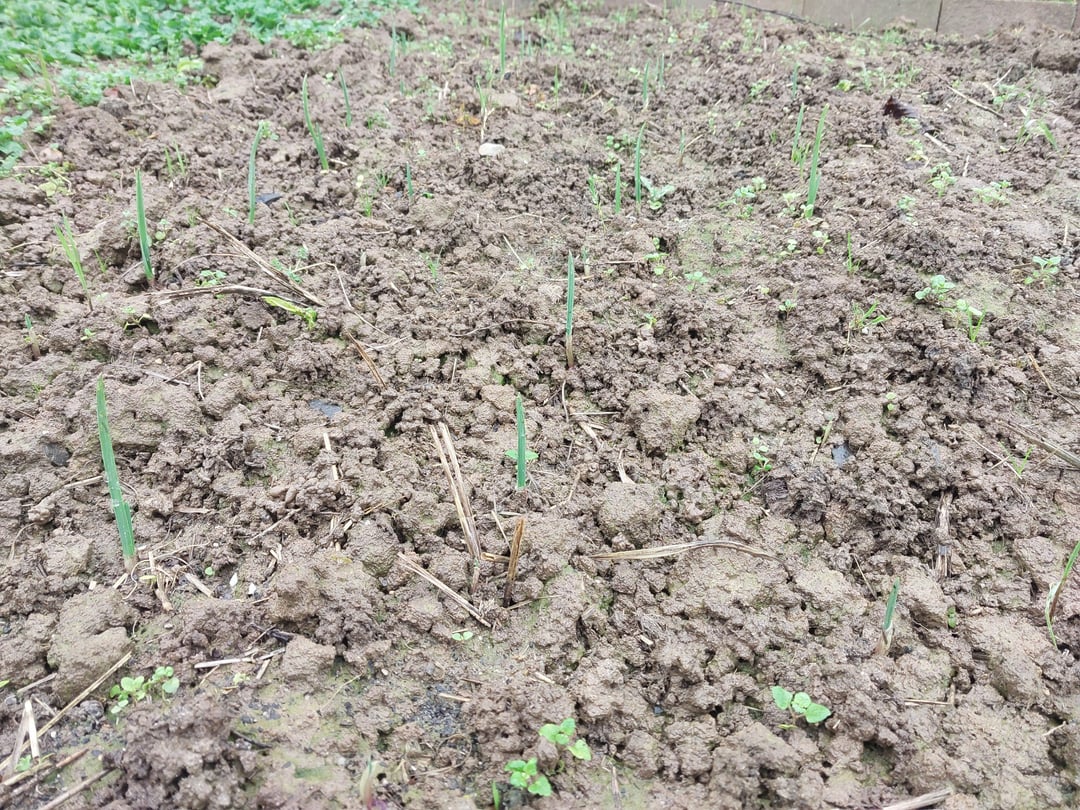 Als erste Kultur 2026 ist der Knoblauch gut aufgegangen. Die Größe finde ich in diesem Jahr auch perfekt: grüne Blattspitzen, aber noch nicht so viel Laub, dass es da zu größeren Schäden durch Frost und Schneedecke kommen wird.