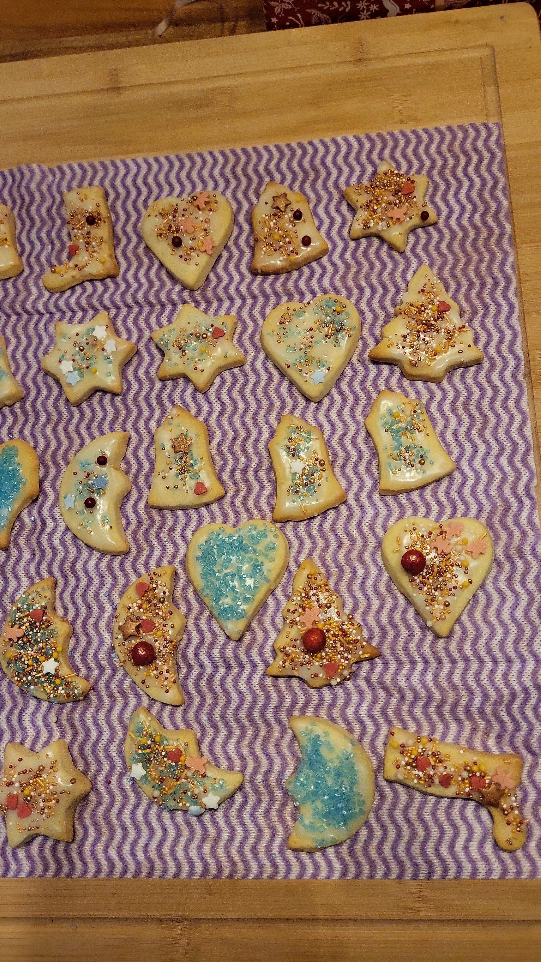 Bin mama eines einjährigen. Hatte mit backen nie was am Hut und wollte dies ändern, weil kinder ja backen mögen und ich nicht wie ein absoluter amateur mit dem kind die kekse backen will wenn es soweit ist – also gibt's heute zu jedem geschenk eine kleine tüte selfmade plätzchen. (Für die Kids natürlich mit deutlich weniger zucker.)
