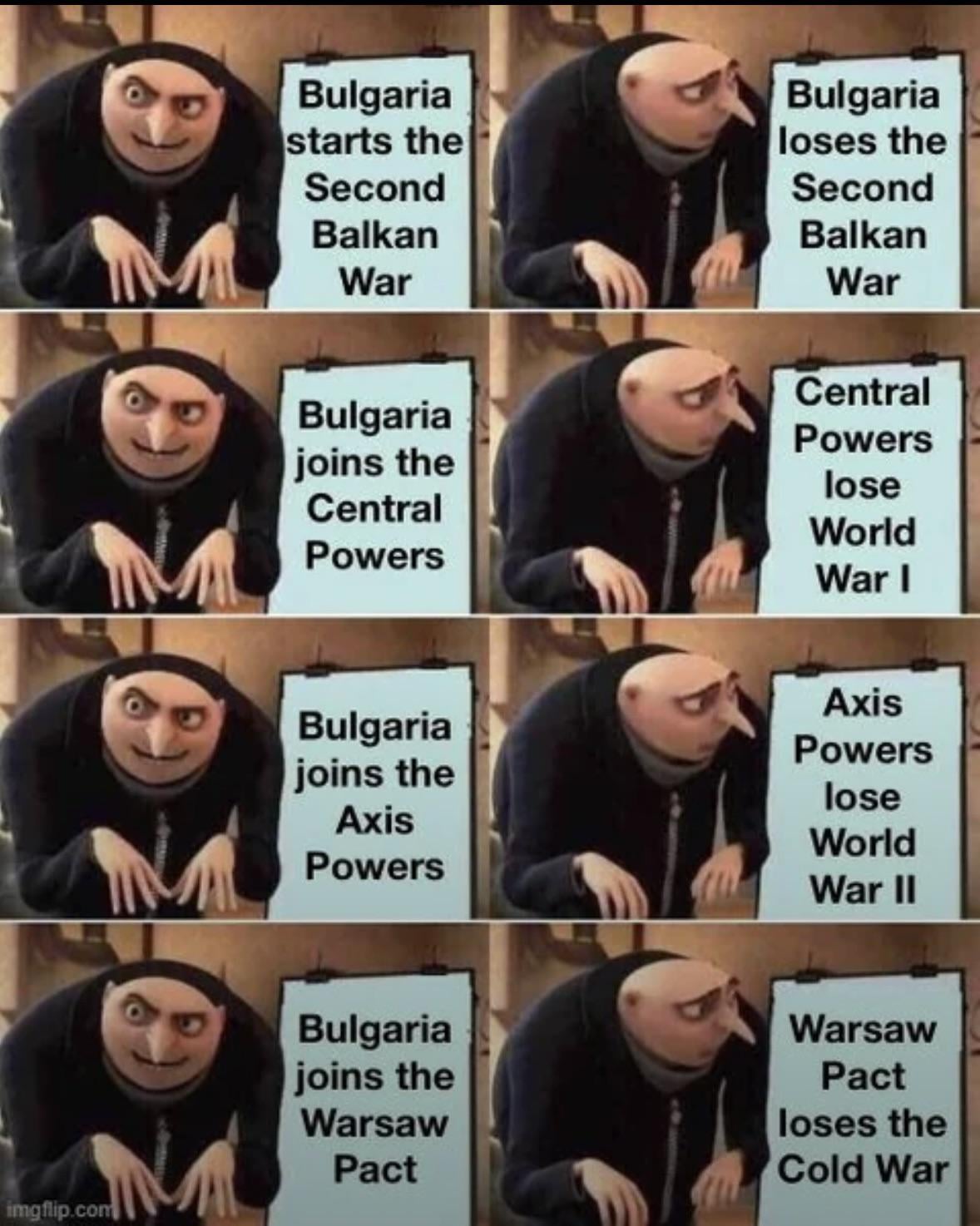нещо подобно все ми е на акъла. как се мислим за много хитри с германия и после ни е_ат след края на войната. сега искам да сме с русия (което е така, но гнидите ги е срам да го заявят гордо), русия да загуби/не спечели нищо съшествено и после искам пак да ни е_е ес мощно.