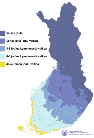 Die Leute sind verrückt wegen des fehlenden Schnees, aber die Statistiken zeigen, dass es zumindest in Süd- und Westfinnland nicht wirklich ungewöhnlich ist. Die Karte des Finnischen Meteorologischen Instituts zeigt die Wahrscheinlichkeit weißer Weihnachten in verschiedenen Teilen Finnlands von 1990 bis 2020.