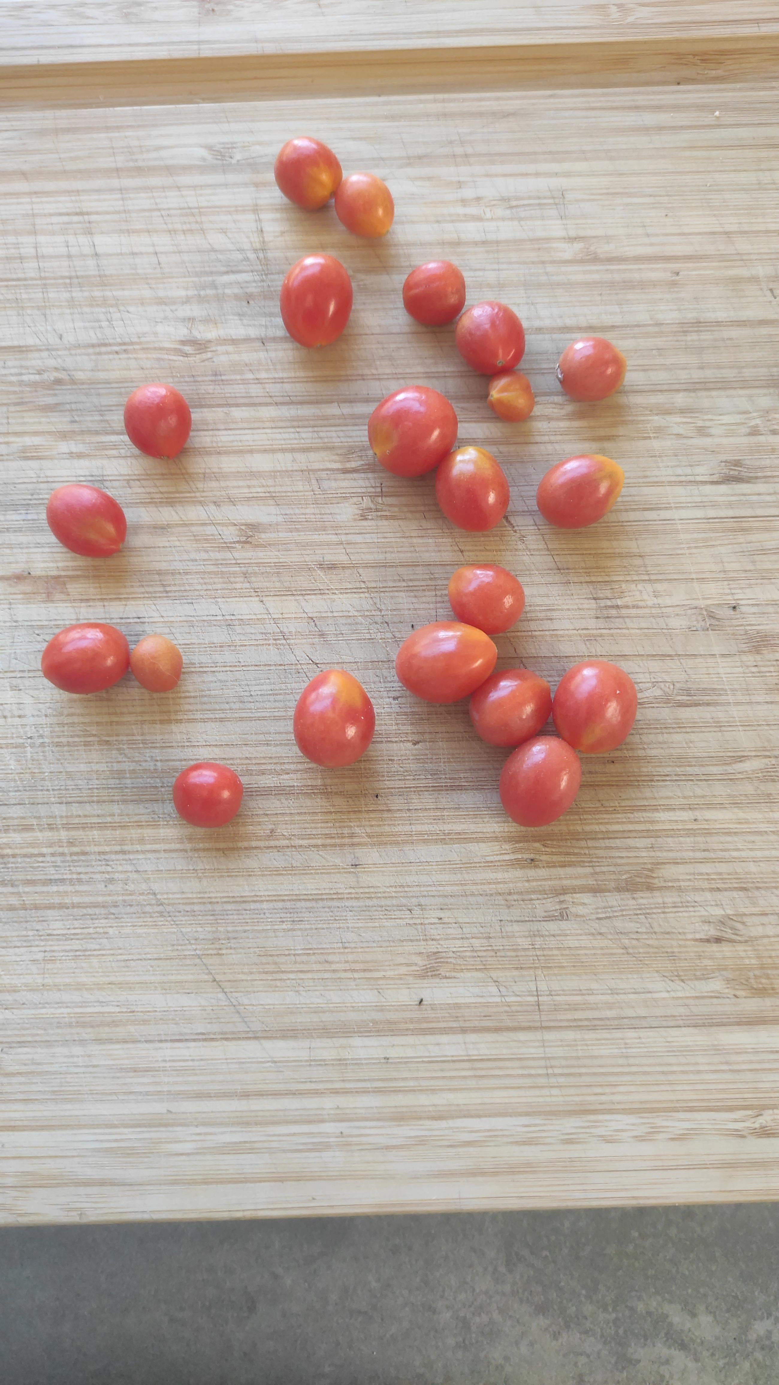 Das sind die allerletzten Tomaten, die ich vor 2 Monaten noch grün ins Haus geholt hab und in einer Papiertüte mit einem Apfel habe nachreifen lassen.