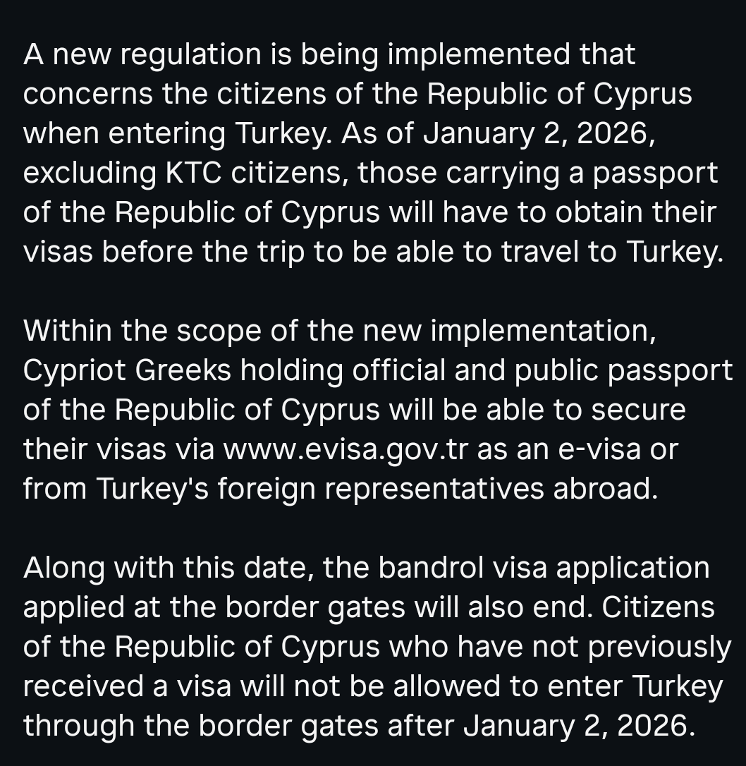 Es scheint, dass Zyprer (Griechen) ab Januar 2026 ein Visum benötigen, um die Türkei zu besuchen. Über die Zahl der Besucher aus Zypern wurde noch nie gesprochen, aber ich gehe davon aus, dass dies eine Vergeltungsmaßnahme vor Schengen sein könnte. Visa können bei dtvgroup.com.tr beantragt werden