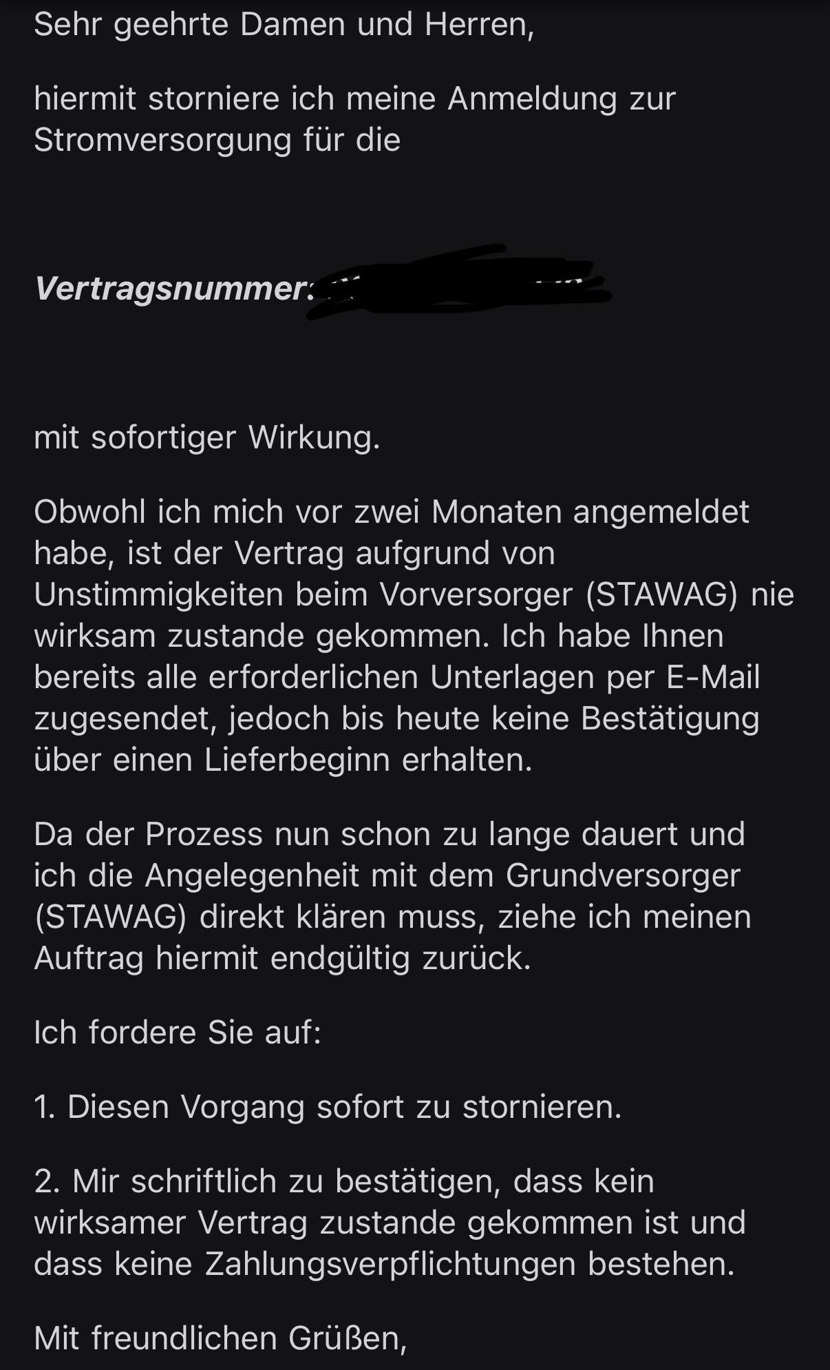 An diesem Punkt fühlt sich jedoch alles sehr kompliziert an und ich möchte das Problem, dass der Stromvertrag unter dem falschen Namen läuft, zunächst mit der STAWAG klären. Daher habe ich E.ON per E-Mail um die Stornierung meiner Bewerbung gebeten.