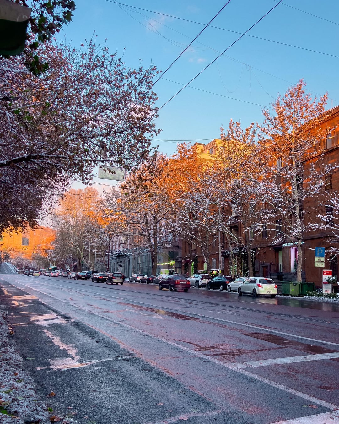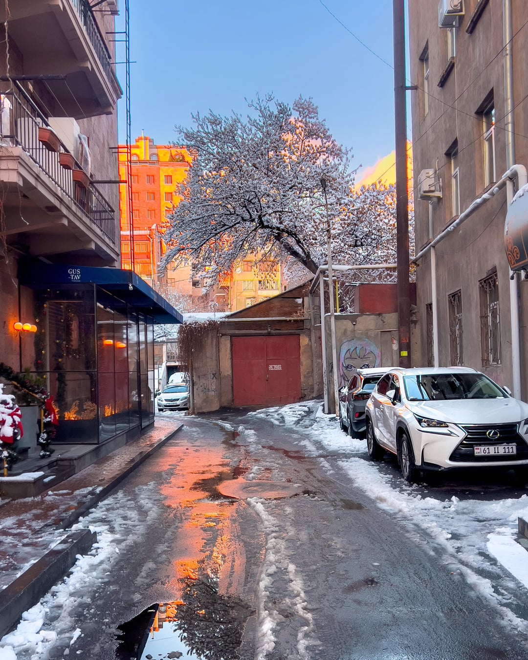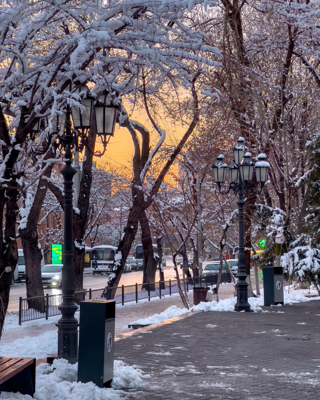 Einer der schönsten verschneiten Sonnenuntergangsabende in Eriwan. Die Sonne schien auf die schneebedeckten Bäume und Dächer. Es war ein wunderschöner Tag für einen Spaziergang durch die Stadt.