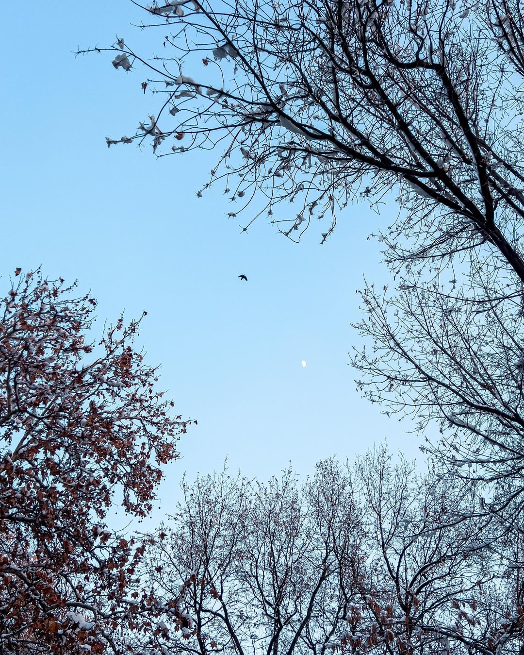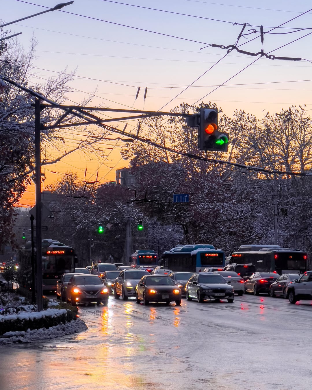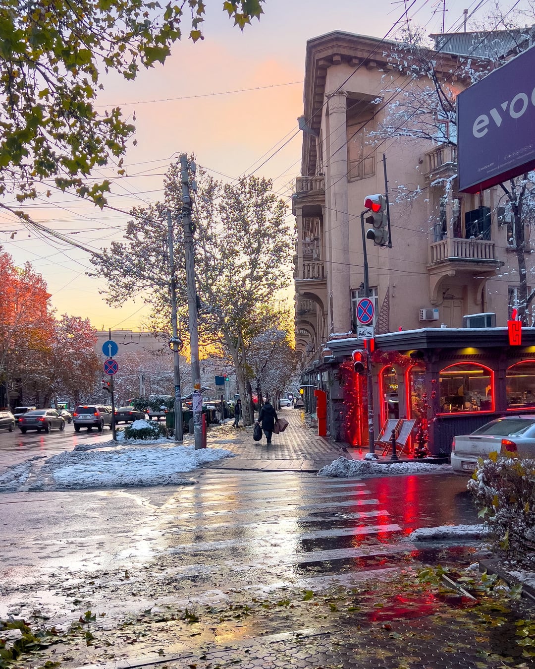 Einer der schönsten verschneiten Sonnenuntergangsabende in Eriwan. Die Sonne schien auf die schneebedeckten Bäume und Dächer. Es war ein wunderschöner Tag für einen Spaziergang durch die Stadt.