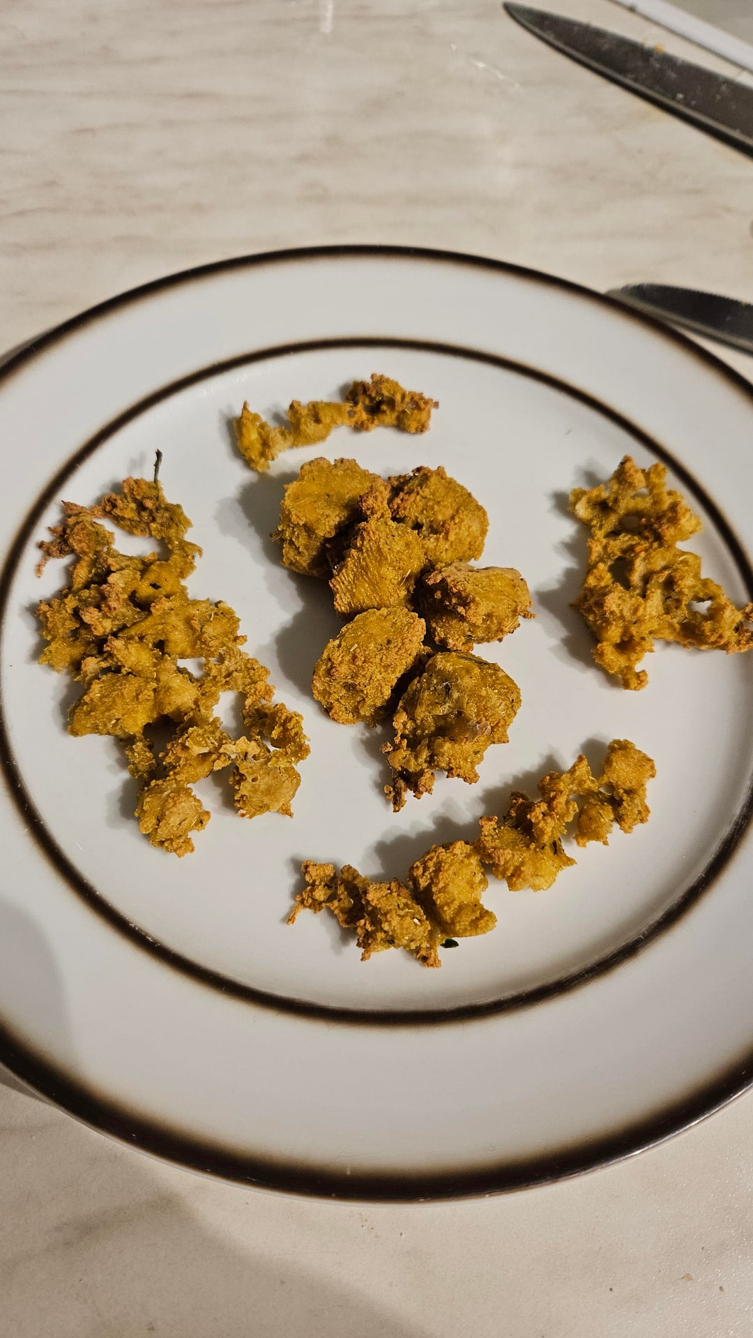 Bröseliger Discounter Tofu zerfällt ein bisschen mehr. Find ich aber nicht schlecht weil das diese ketten artigen knusper happen gibt die im 3. Bild aussen um die Stücke herum zu sehen sind. Aber guter fester Tofu zB Taifun bleibt wunderbar in Stücken.