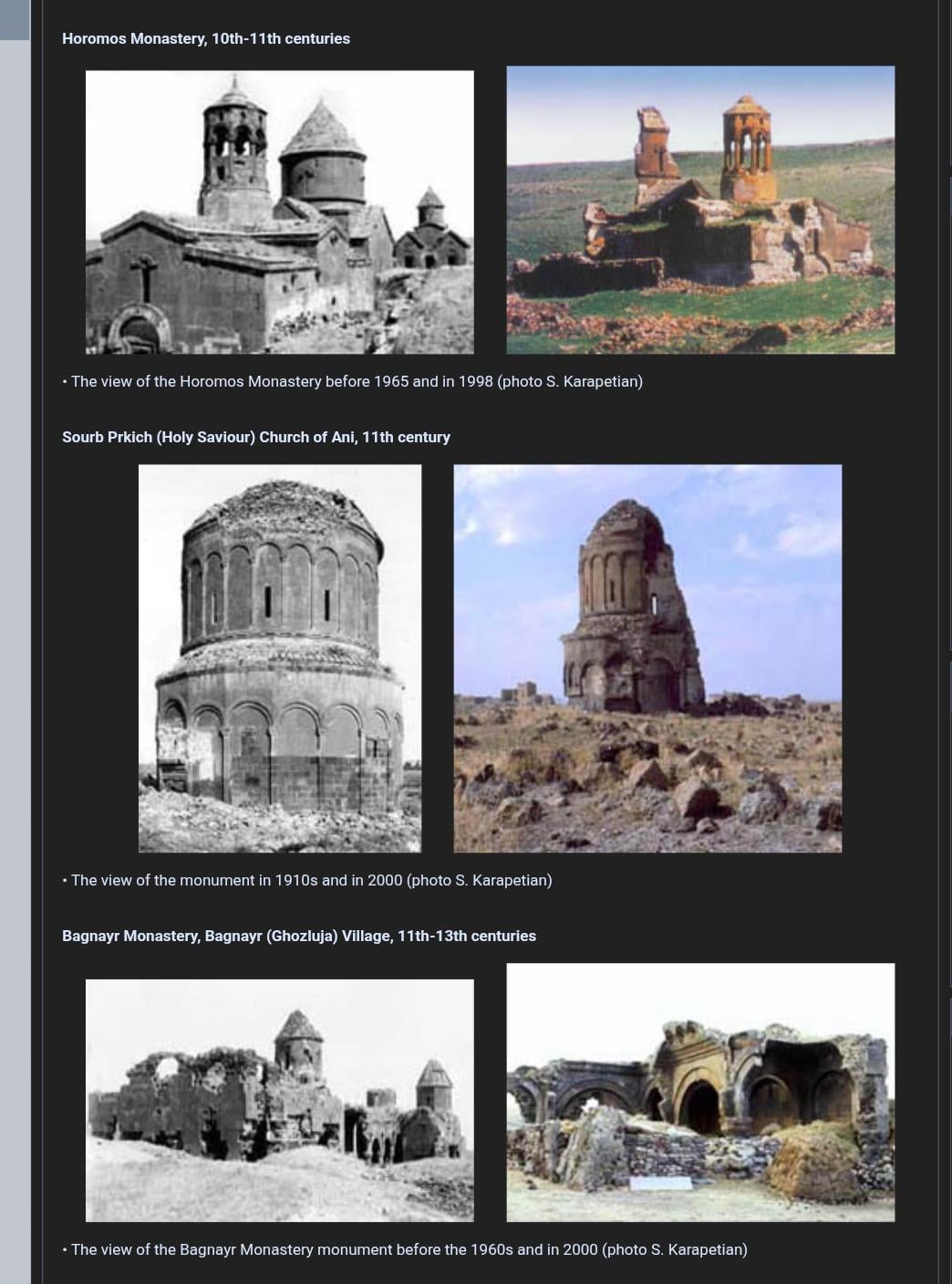 "Im Jahr 1974 erklärte die UNESCO, dass nach 1923 von den 913 im Osten der Türkei verbliebenen armenischen historischen Denkmälern 464 vollständig verschwunden seien, 252 in Trümmern lägen und 197 reparaturbedürftig seien. Armenische Architekturgebäude werden regelmäßig mit Dynamin zerstört und als Ziel bei türkischen Militärübungen verwendet; Die unbeschädigten Steine ​​werden als Baumaterial verwendet. In einigen ländlichen Gegenden dienen armenische Klöster und Kirchen als Ställe, Geschäfte, Clubs und in manchen Fällen sogar als Gefängnis. Bei vielen Gelegenheiten wandelte die türkische Regierung armenische Kirchen in Moscheen um."