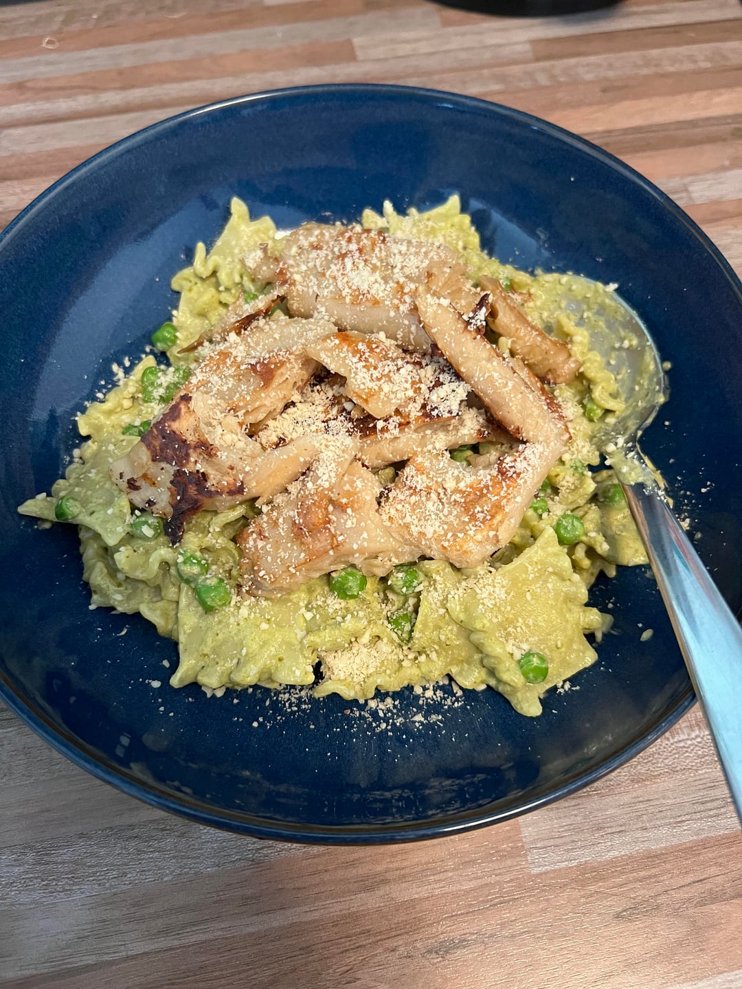 sahnige pesto pasta mit erbsen und crispy hühnchen