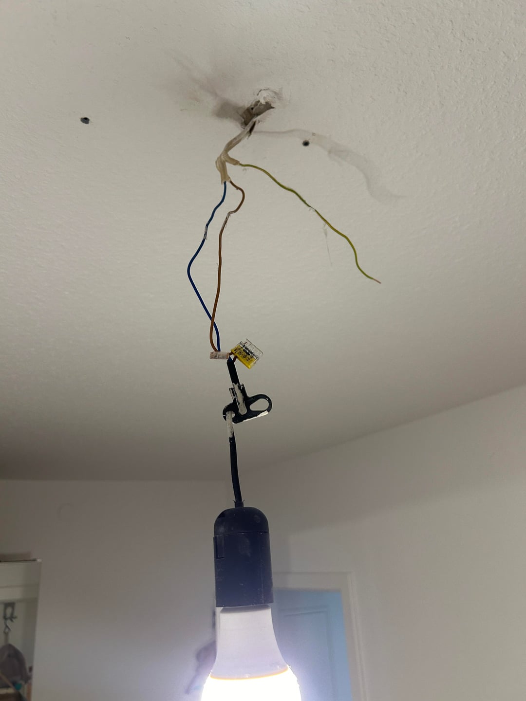 Die ersten beiden Bilder stammen aus meinem Wohnzimmer. Ich habe die Glühbirne herausgenommen, um sie an meiner Lampe zu verwenden, und als ich versuchte, sie erneut anzuschließen, ließ sie sich nicht mehr einschalten. Das dritte Bild stammt aus meinem Schlafzimmer, wo die Verkabelung gleich ist. Ich habe versucht, genau nachzubilden, wie es in meinem Schlafzimmer aussieht, aber es funktioniert immer noch nicht.