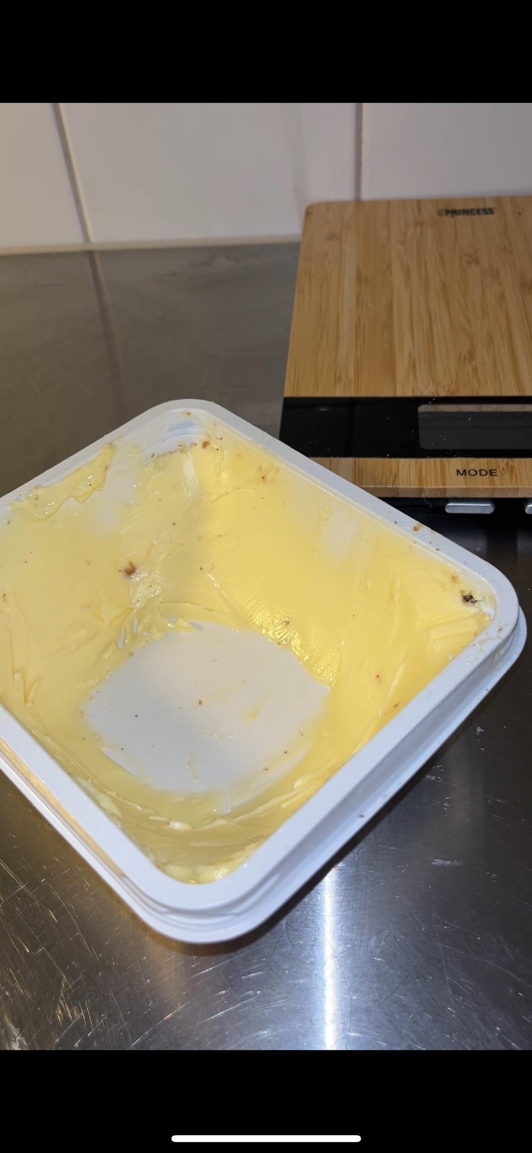9. Dedär kökskaklet kombinerat med köksvåg permanent placerad på bänken som är av rostfritt stål känns skakiga
