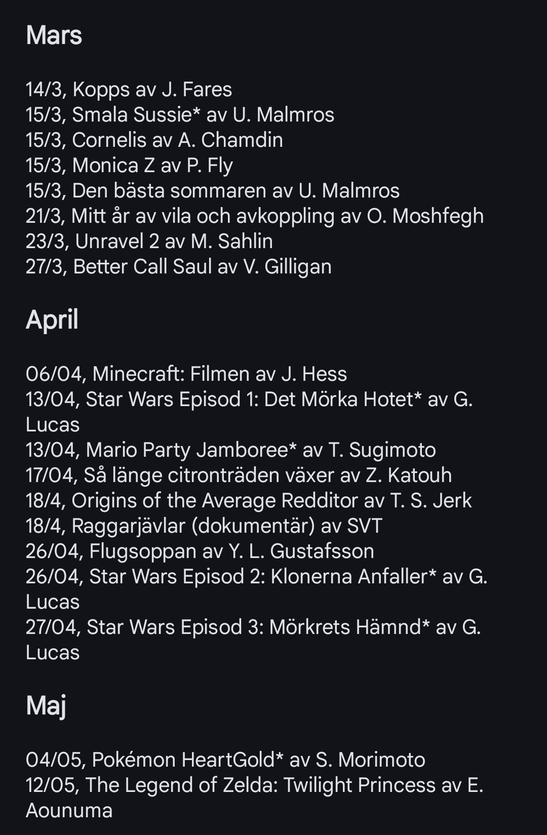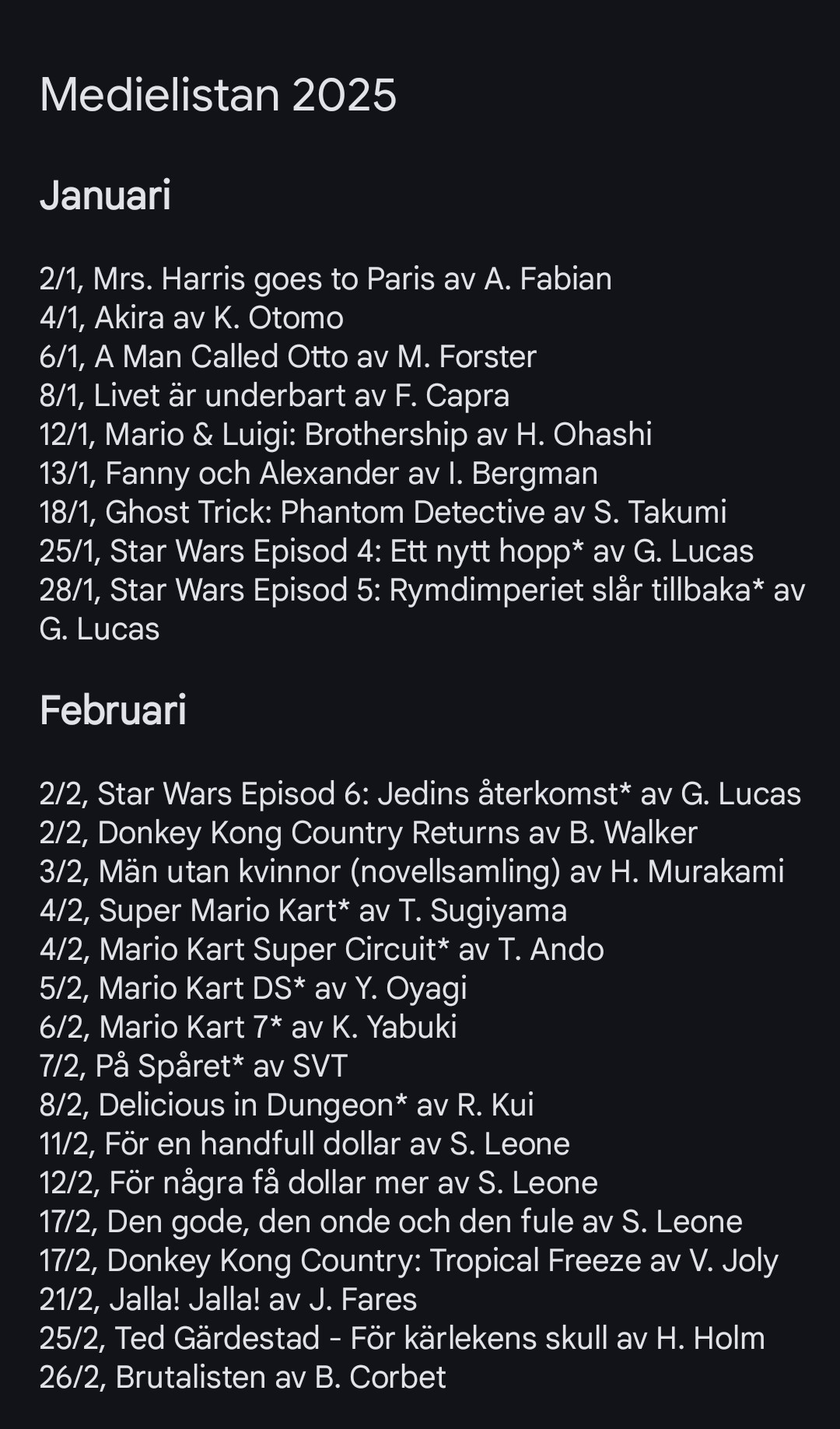 Ich fühle mich etwas hinter der Zeit zurückgeblieben, wenn es um allgemeine Bildung geht, insbesondere um Filme, da ich nicht sehr viele gesehen habe. Mein Vorsatz für das neue Jahr 2025 bestand daher darin, noch viele weitere Filme anzusehen, sie alle aufzuschreiben und am Ende des Jahres darüber nachzudenken. Ich muss sagen, dass ich mit dem, was ich gesehen habe, zufrieden bin, 2025 war wahrscheinlich das Jahr in meinem Leben, in dem ich die meisten Filme gesehen habe. Wie war Ihr Medienjahr? Das war ein ziemlich lustiges Projekt, deshalb habe ich vor, das Gleiche im Jahr 2026 noch einmal zu tun. Mit einem zusätzlichen Neujahrsvorsatz, weniger Zeit im Scroll-Sumpf zu verbringen, weil es dieses Jahr zu viel Social Media und Gehirnfäule für mich gab.