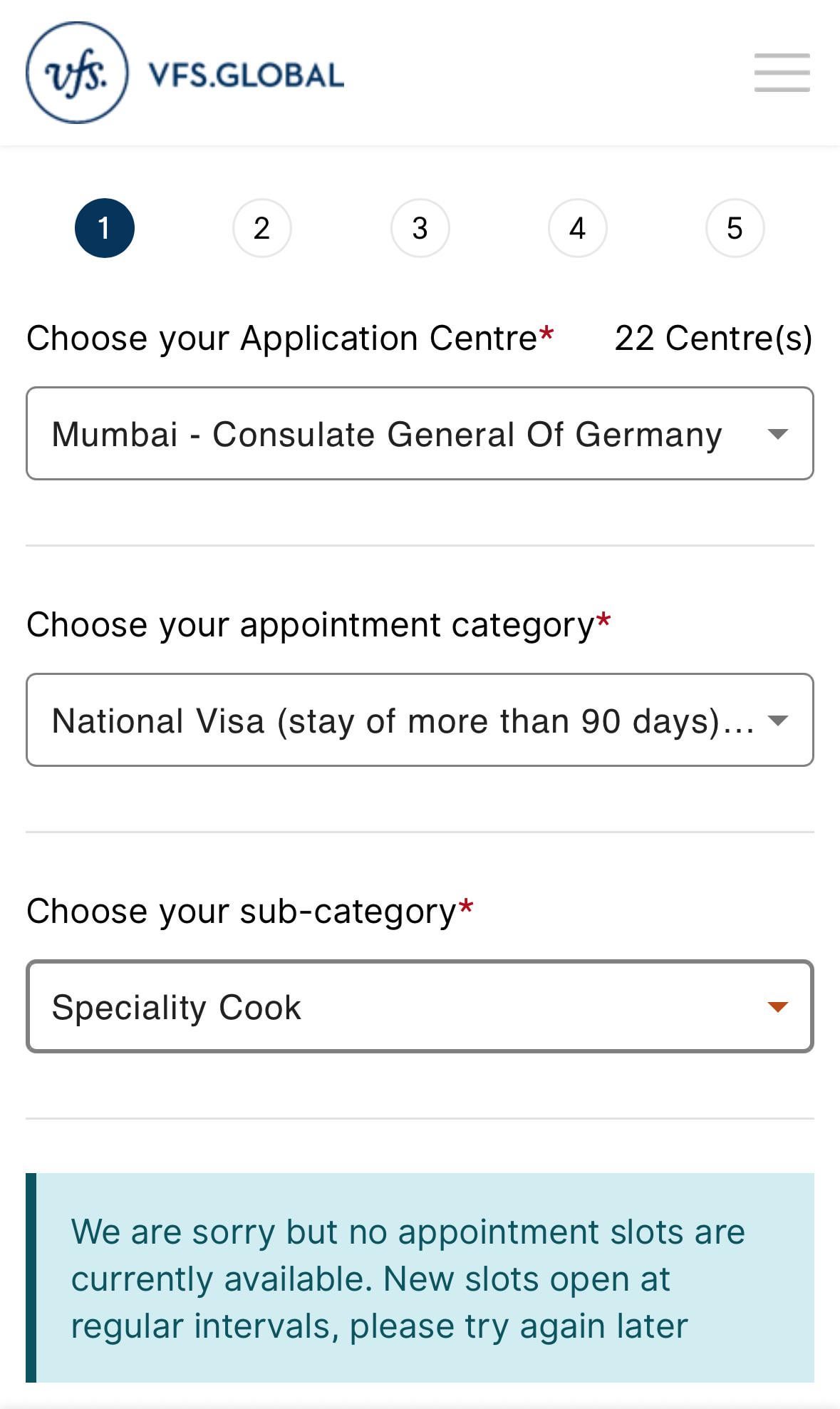 Hallo zusammen, ich suche seit einigen Monaten auf dem Portal VFS Global – Mumbai (Generalkonsulat von Deutschland) nach einem Termin für ein National Visa (Spezialitätenkoch).