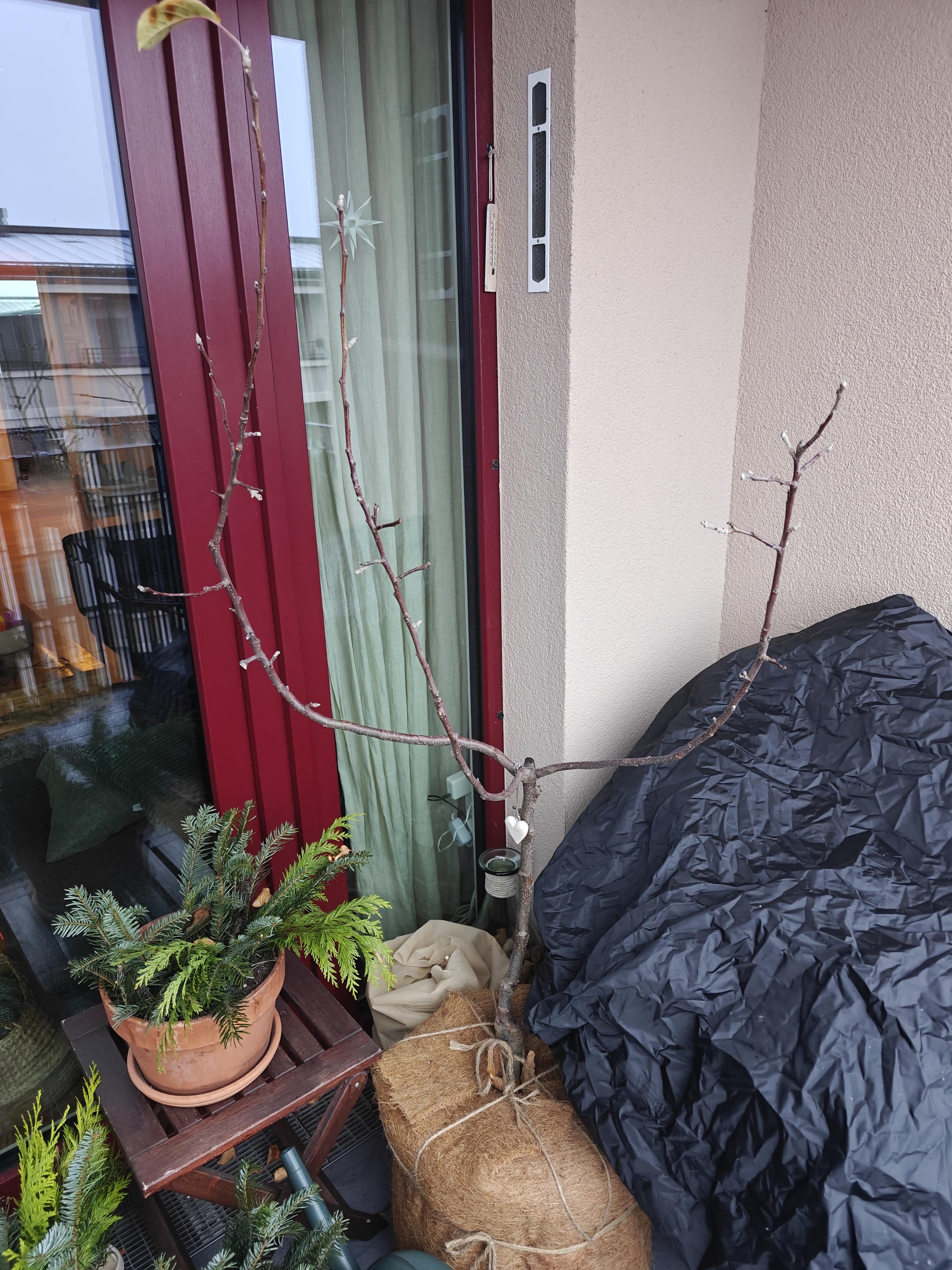 Zur Hochzeit im Mai 2024 haben wir einen Apfelbaum im Topf geschenkt bekommen, der bei uns auf dem. Balkon steht und gerade überwintert.