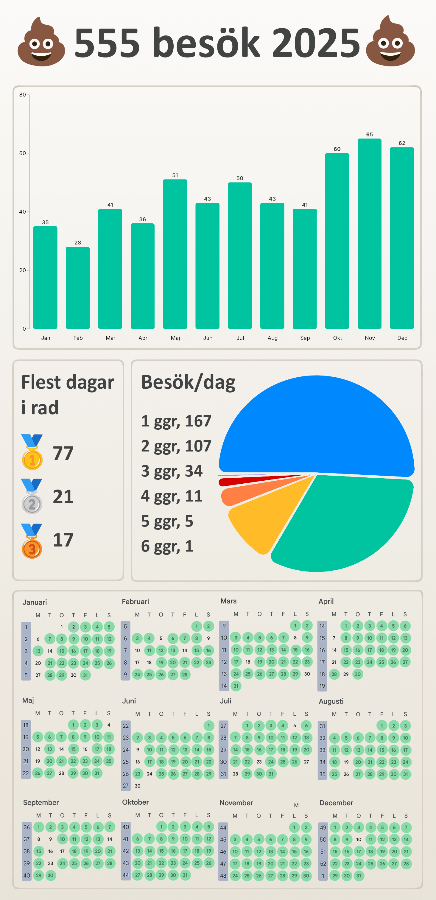 Die Tage mit 4+ Besuchen lassen sich meist durch Laktoseeinnahme oder starkes Essen erklären.