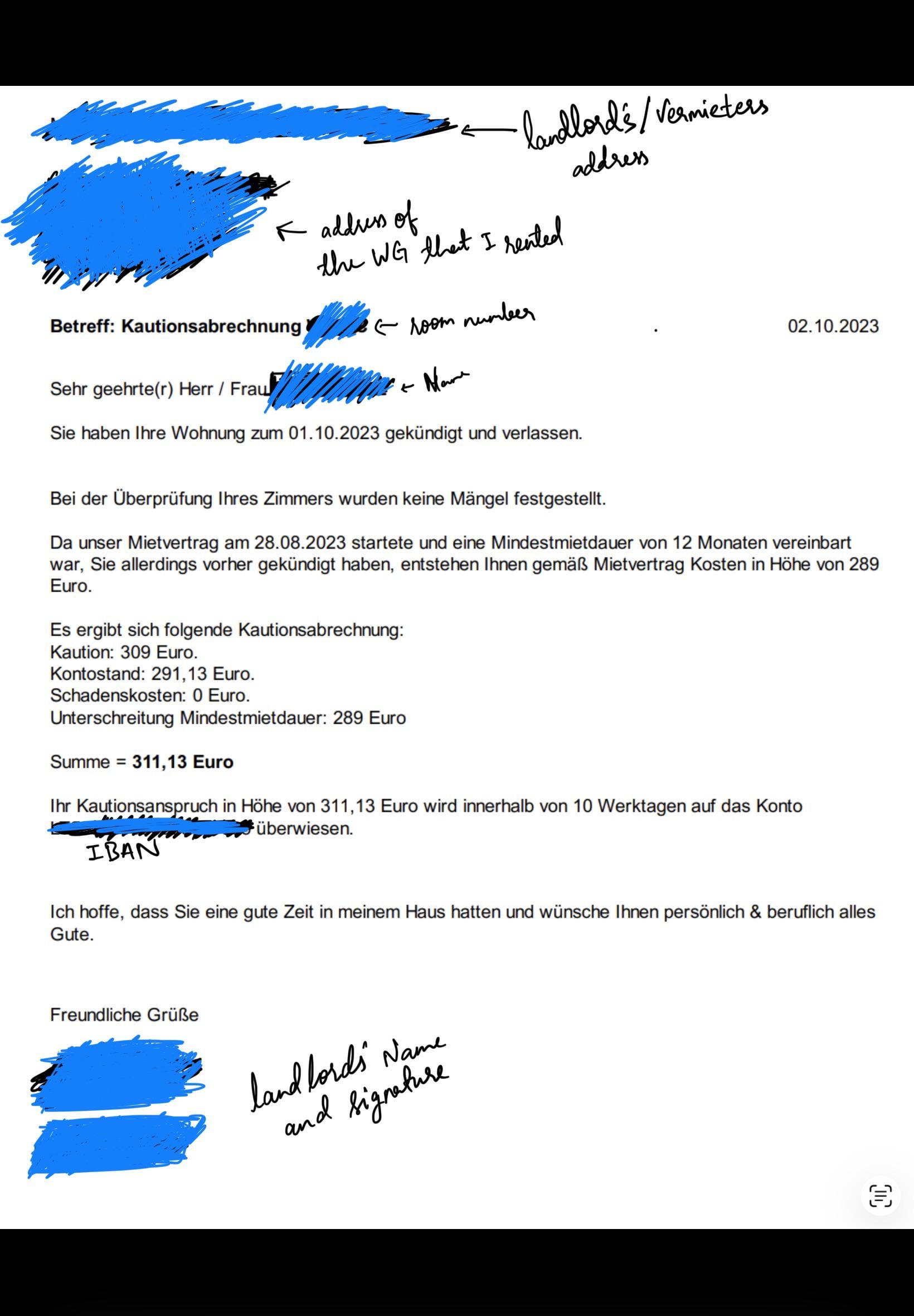 Ich weiß, es ist schon eine Weile her, aber ich wusste nicht, dass ich auf Reddit Hilfe bekommen könnte. Kurz gesagt: Ich habe diese Wohnung gemietet, bin aber vorzeitig ausgezogen. Laut Vertrag habe ich jemanden gefunden, der meinen Mietvertrag übernimmt (hätte ich niemanden gefunden, hätte er mir 289 € für die vorzeitige Kündigung berechnet). Daher beträgt mein Kontostand 291 € (289 € erstattet + 2 € Gutschrift aus der vorherigen Aufladung).