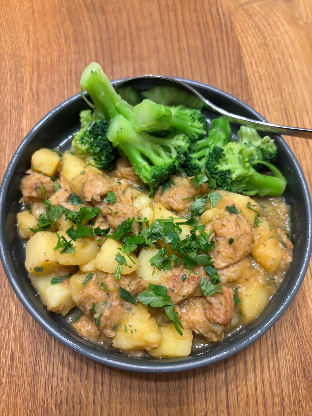 Zharkoje/Жаркое/russischer Kartoffeleintopf mit Sojamedaillons. Normalerweise kommen da noch Karotten rein, hatte ich nicht, als gab’s noch Brokkoli als Beilage.