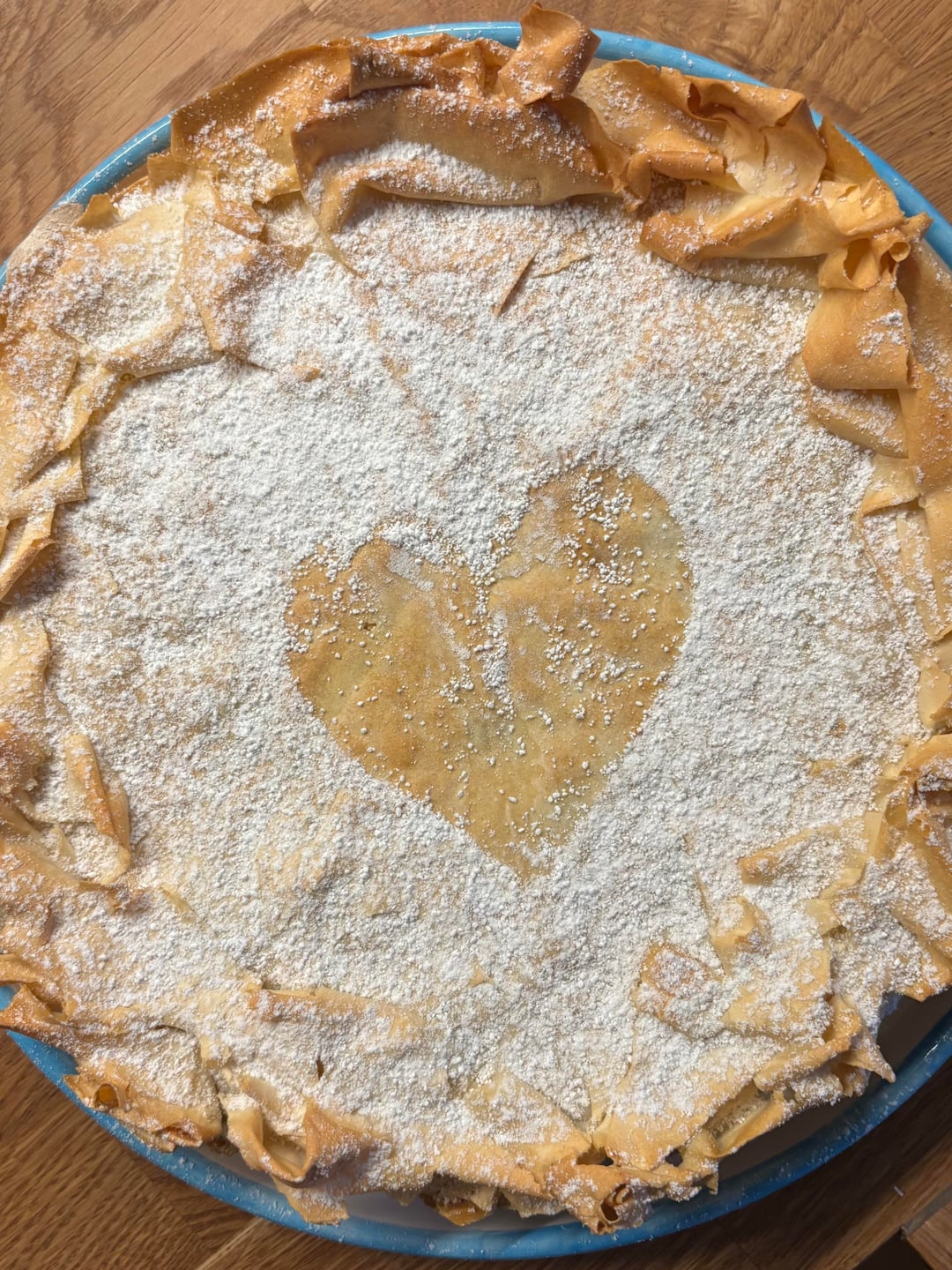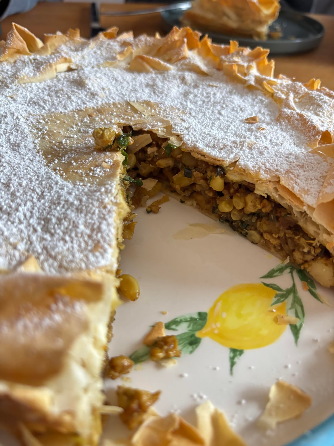 und 5. Pastilla/Bastilla – ein fabelhaft süß-salziges marokkanisches Gebäck aus Filoteig, das eigentlich mit totem Tier gefüllt wird, in meiner Version aber mit Tofu, Pinienkernen und Reisnudeln als Füllmasse daherkommt. Die Kombi aus Puderzucker und würziger Füllung ist einfach super.