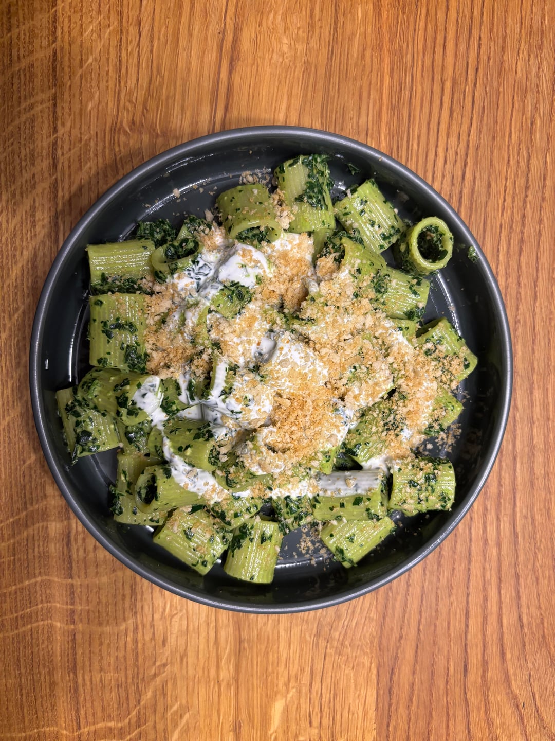 Pasta mit Schwarzkohl-Pesto, Zitronenschmand und käsig-crunchigem Panko-Topping (veganisiertes Rezept nach sophia_sofire auf Instagram)