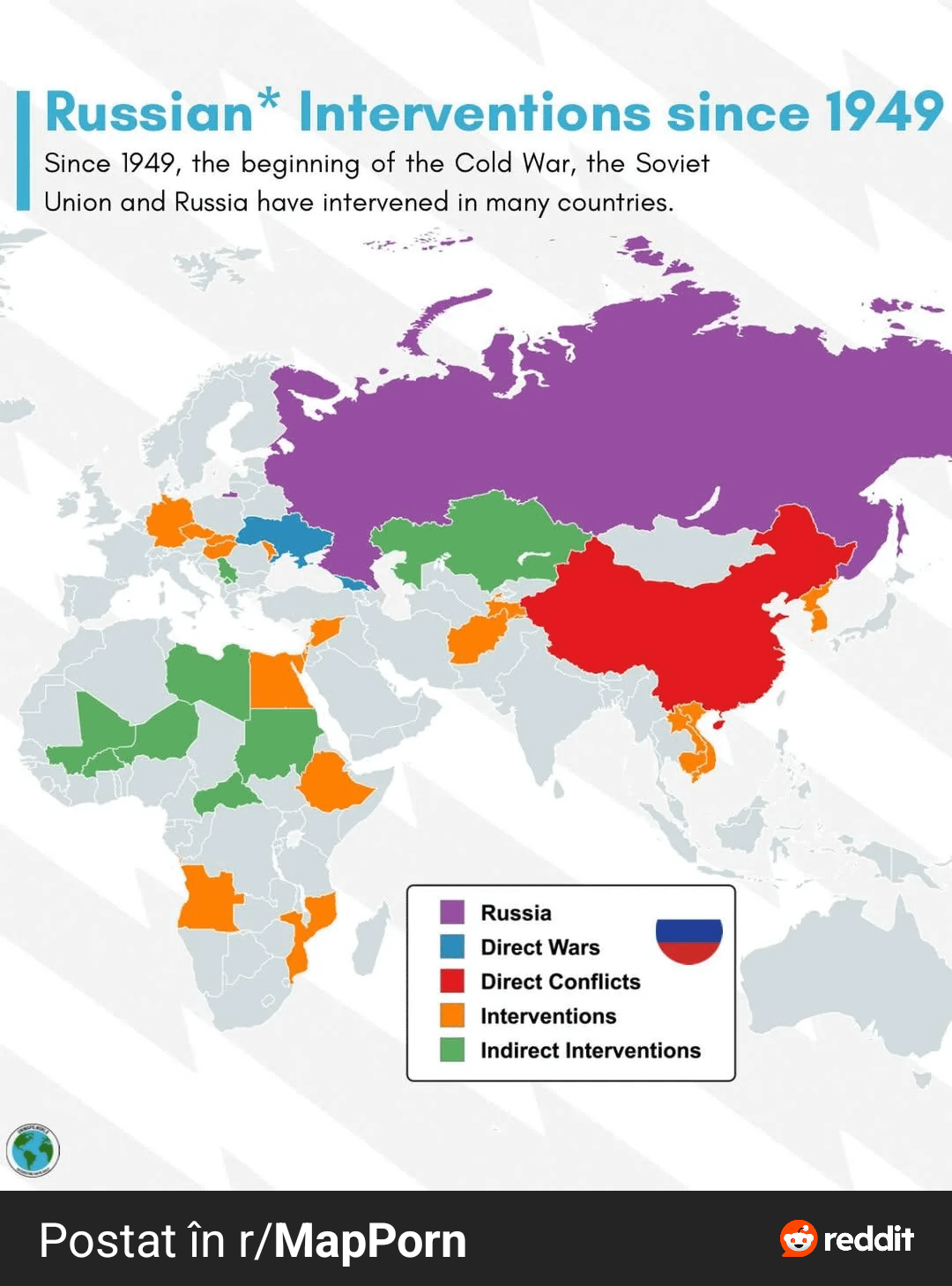 Nu-s fan Rusia, da hai sa vedem si o mapa cu interventile SUA😂. Aceste doua state teroriste..Sa fie si invazia Groenlandei ca e pe vine😂
