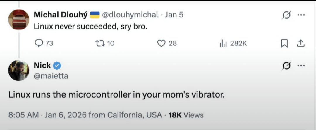 Ale prečo je to vtipné keď to nie je ani pravda? Mikrokontrolery v malých consumer zariadeniach majú pamäť v radách kb a na Linux toto určite nestačí. Nepotrebuje náhodou aj mmu? Som jedina ktorej to vtipné nepríde či je to len môj undiagnosed autism