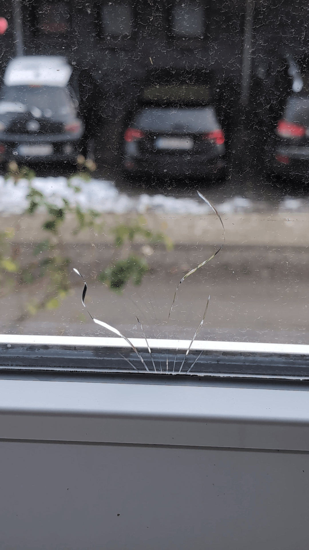 Als ich aufwachte, bemerkte ich diesen Riss an meinem Fenster. Es ist drinnen, aber ich weiß nicht, wie das passiert ist. Normalerweise öffne ich das Fenster vollständig, um den Raum zu lüften, also ist es vielleicht auf einen Gegenstand gestoßen, der auf der Arbeitsplatte lag …