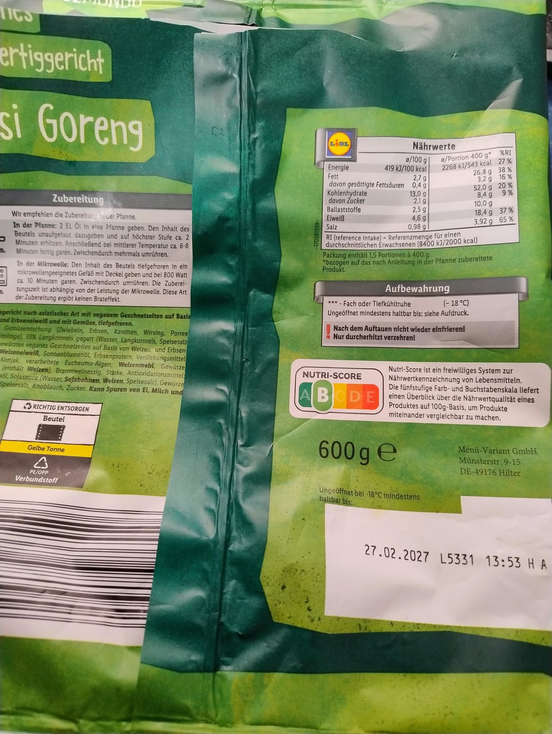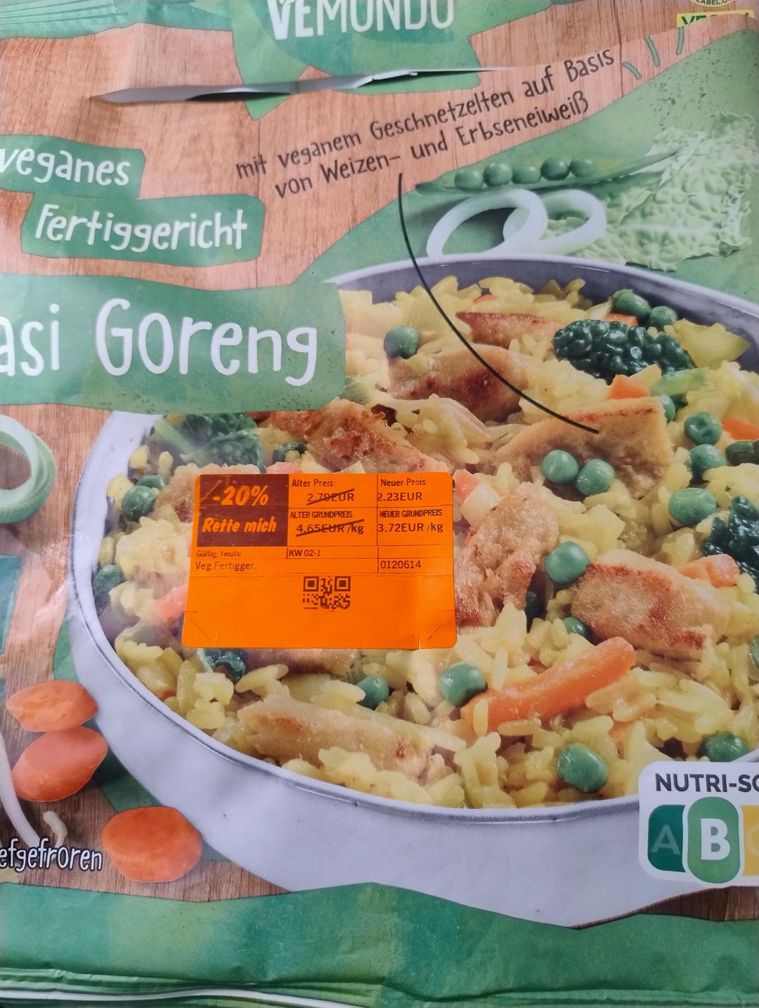 Ich habe mir heute zum Mittag eine Packung veganes Fertiggericht Nasi Goreng der Marke Vemondo gemacht.