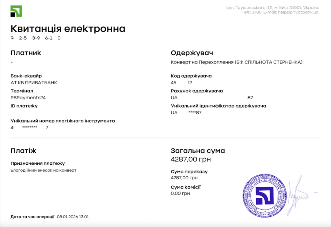 Derzeit beläuft sich der Gesamtbetrag auf ≈36.963 USD (1.584.400 Griwna), sodass für 2026 weitere 29.703 USD (1.273.200 Griwna) und für 2027 weitere 33.333 USD (1.428.800 Griwna) vorgesehen sind.