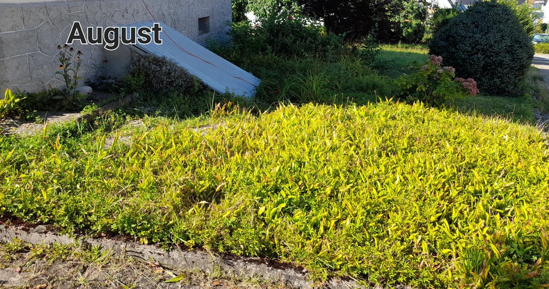Pass auf, dass sich die Ausläufer von dem Cornus alba, die im Bild von Juni sichtbar sind, nicht weiter ausbreiten.