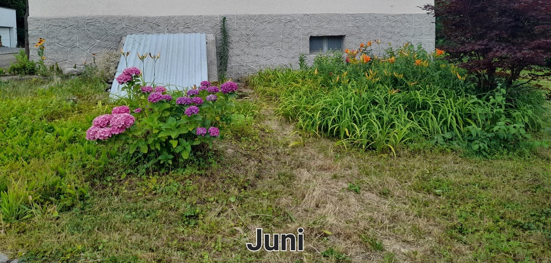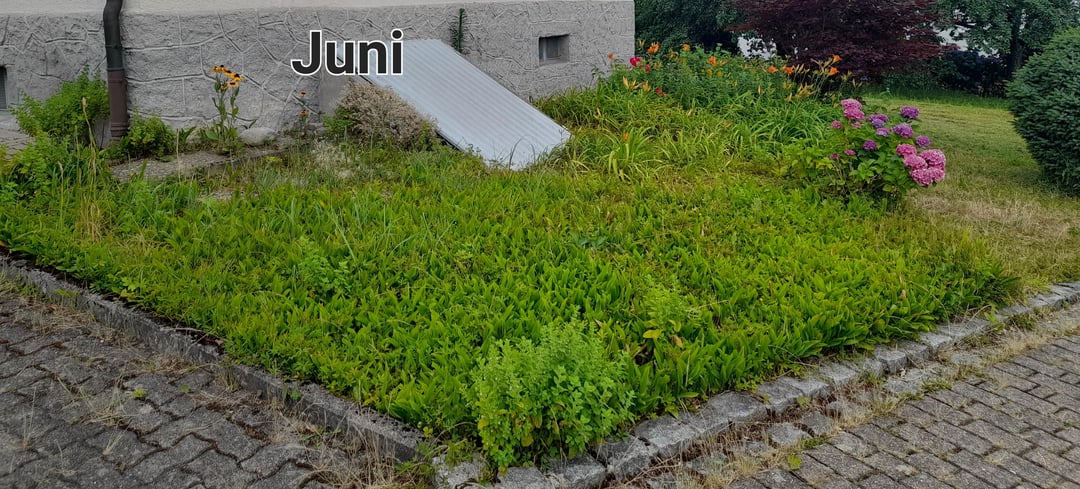STATUS QUO: Links neben dem Kellerzugang gibt es viel Maiglöckchen und kriechendes Fingerkraut, Gräser, eine Handvoll Zwiebelblumen. Mittig eine Hortensie. Rechts beim Ahornbaum wachsen wild durcheinander u.a. Lilien, eine Rose usw. (siehe Detailsicht Juni).