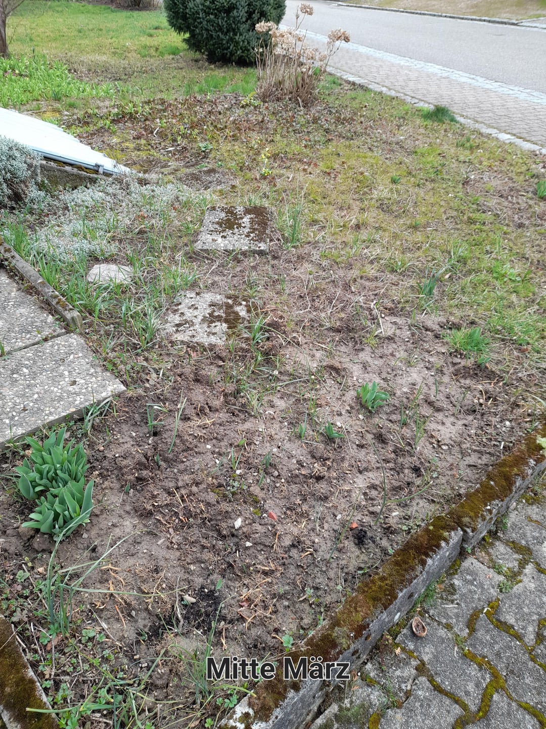 PLAN: Im Winter alles Kraut im Bereich links händisch abpflügen, um das Kriechende Fingerkraut loszuwerden. Den Bereich links inkl. der Hortensie mit Rindenmulch bedecken. Ggf. mit einer Reihe Steinen aus dem Baumarkt abgrenzen zum rechten Bereich. Die Maiglöckchen bekommen den größten Teil, in Richtung Straße. In Richtung Haus möchte ich versuchen, entweder heimische Bodendecker zu pflanzen und/oder mehr Zwiebelblumen.