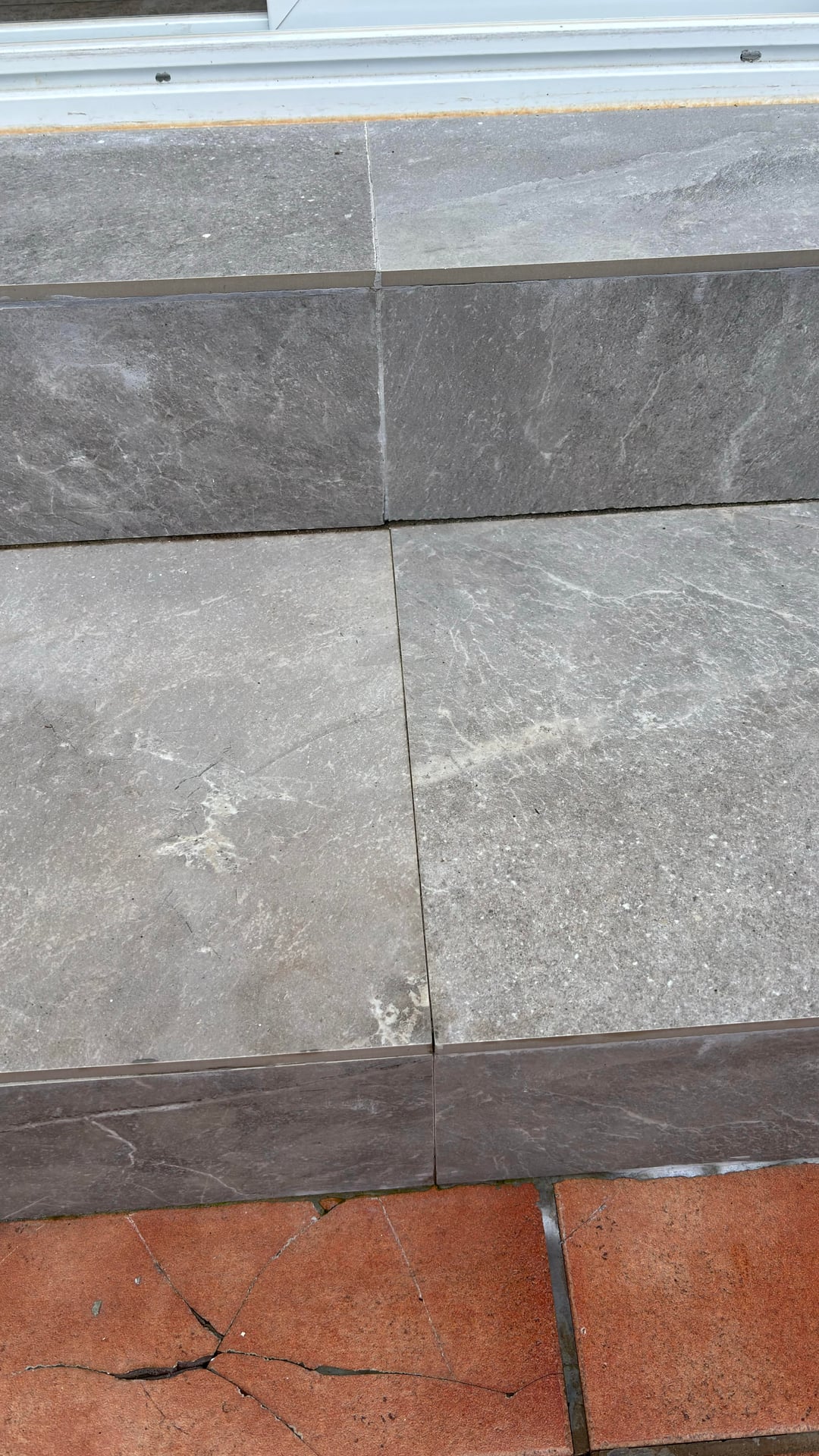 Als vorübergehende Maßnahme habe ich darüber nachgedacht, Silikon in die Fuge einzubauen, durch die meiner Meinung nach das Wasser von der Außentreppe eindringt, aber das ist keine langfristige Maßnahme. Was schlagen Sie vor, was ich langfristig tun könnte, um zu verhindern, dass erneut Wasser eindringt? Gibt es eine Lösung, bei der nicht die Stufe zerbrochen und eine neue wasserdichte Stufe wieder zusammengebaut werden muss?
