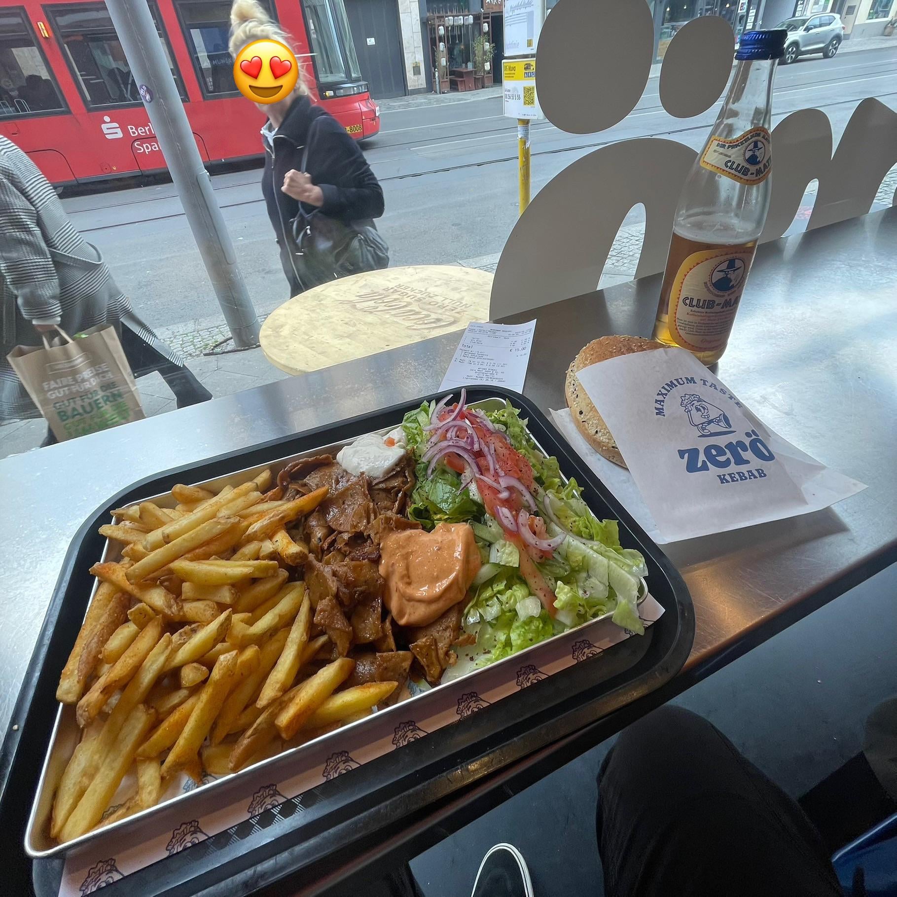Bestimmt 16€ und eigentlich 50% billige Pommes. Traurige Portion. Brot ist auch winzig. Siehe Mate Flasche zum Vergleich