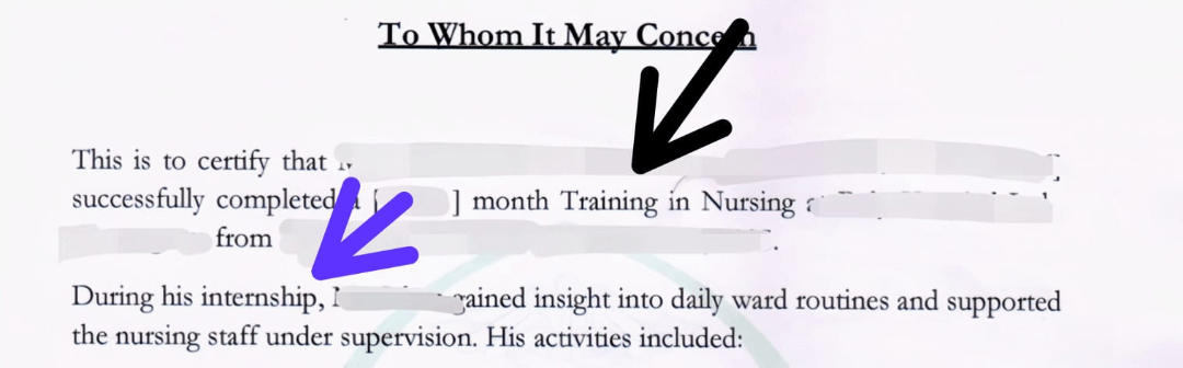 Aus bestimmten Gründen (die ich im Moment nicht offenlegen möchte) musste ich ein Praktikum in einem Krankenhaus in meinem Heimatland absolvieren. Ich wurde gebeten, das Zertifikat selbst vorzubereiten. An den beiden unten markierten Stellen habe ich zunächst das Wort „Praktikum“ geschrieben. Allerdings teilte mir der Manager mit, dass er das Zeugnis nicht unterschreiben würde, wenn das Wort „Praktikum“ verwendet würde. Deshalb wies er den Computerbetreiber an, das Wort durch „Schulung“ zu ersetzen. Leider hat der Computerbetreiber das Wort nur an einer Stelle ersetzt und die andere Stelle so gelassen, wie sie war (mit Praktikum).