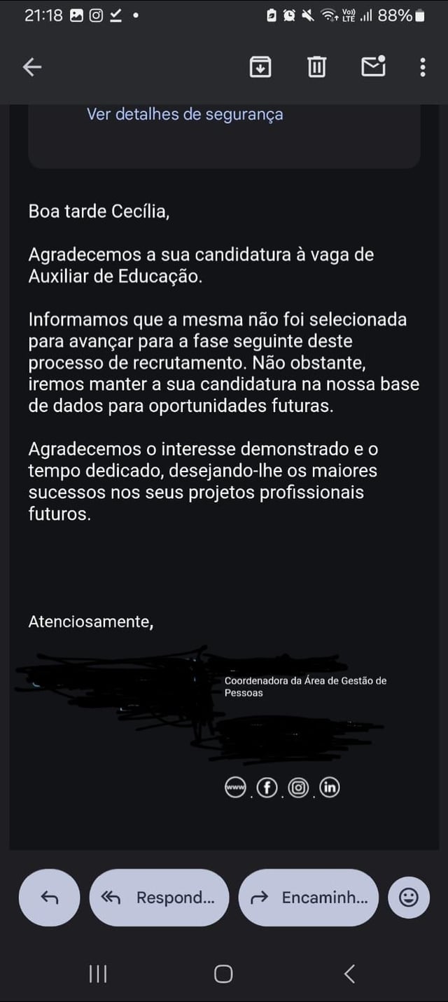Zusammenfassend stellt sich die Situation wie folgt dar: Ich habe mich für ein Stellenangebot angemeldet, für das ich über Qualifikationen, eine mehrjährige Ausbildung und Berufserfahrung sowie die Fähigkeiten zur Ausübung verfüge, wobei der Arbeitsplatz in der Nähe meines Wohnortes liegt. Ich durchlief zwei Phasen der Rekrutierung, die zweite war ein psychologisches Assessment am 01.07.2026, bei dem mir gleich zu Beginn gesagt wurde, dass es keine richtigen oder falschen Antworten auf die peinlichen Fragen geben würde, die mir gestellt wurden und auf die ich demütigend antworten musste, weil ich einen Job brauchte. Am 01.08.2026 erhielt ich eine E-Mail, in der mir mitgeteilt wurde, dass ich nicht ausgewählt wurde, meine Bewerbung jedoch für zukünftige Stellenangebote in der Datenbank gespeichert würde, und tatsächlich schaltete die Institution in sehr naher Zukunft, praktisch am selben Tag des 01.08.2026, eine neue Stellenausschreibung für die Stelle, auf die ich mich beworben hatte und für die ich zu zwei Vorstellungsgesprächen eingeladen wurde, bei denen ich nur Ressourcen verschwendete und das Gefühl hatte, dass dies der Fall sei "regieren" mit mir. Und das ist der portugiesische Arbeitsmarkt, wo man sagt, dass Arbeitslose diejenigen sind, die nicht arbeiten wollen.