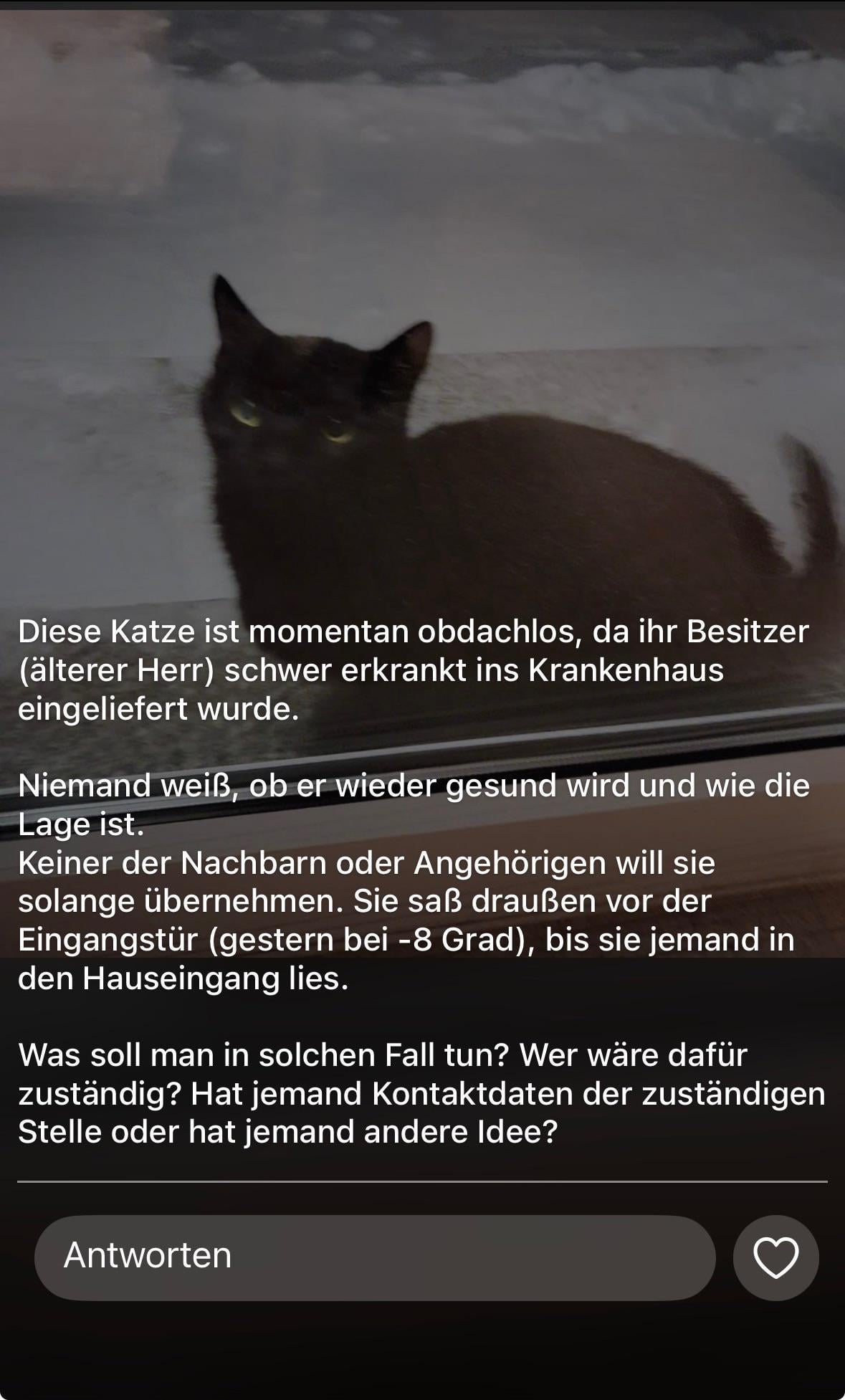 Diese Katze ist momentan obdachlos, da ihr Besitzer (älterer Herr) schwer erkrankt ins Krankenhaus eingeliefert wurde.