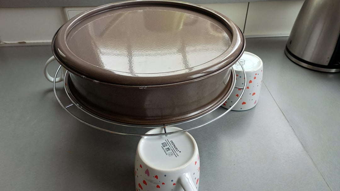 Ich hatte bedenken den Kuchen zum abkühlen Überkopf zu hängen. Es hat aber problemlos funktioniert.