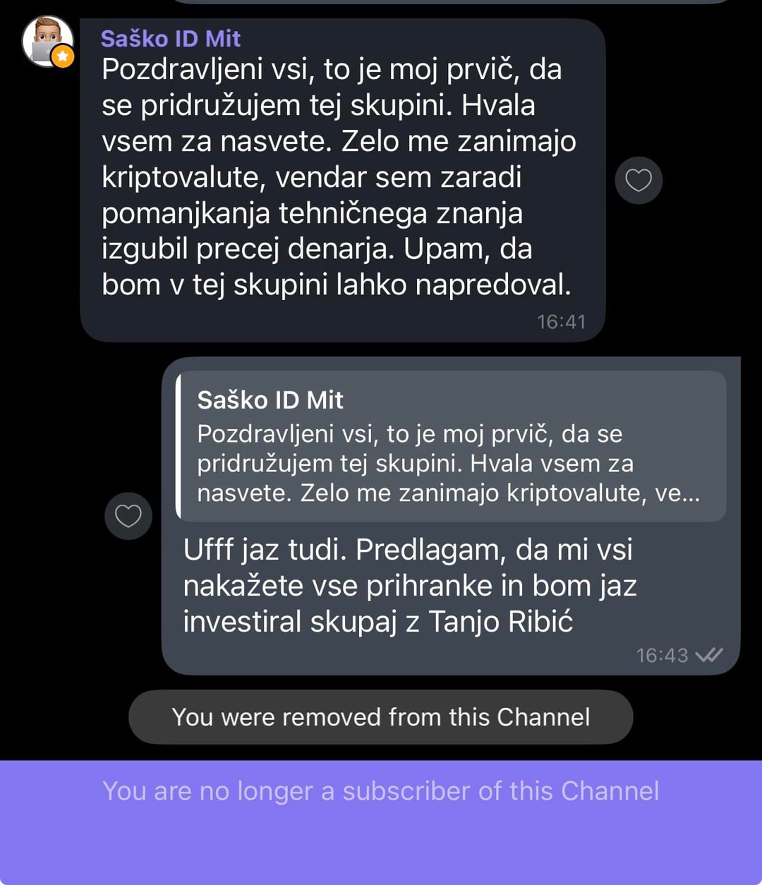 Mene so trikrat do zdaj dodali v neke crypto skupine. Prve dvakrat sem samo takoj zapustila skupino. Tretjič sem počakala, da se je nabralo nekaj ljudi in potem poslala screenshot članka z velikim naslovom v stilu „crypto chat = scam“. V roku 10 sekund sem bila banned iz skupine in od takrat me nihče ni dodal v nobeno skupino več. Ne vem na kateri blacklisti sem pristala, ampak sem kar vesela.